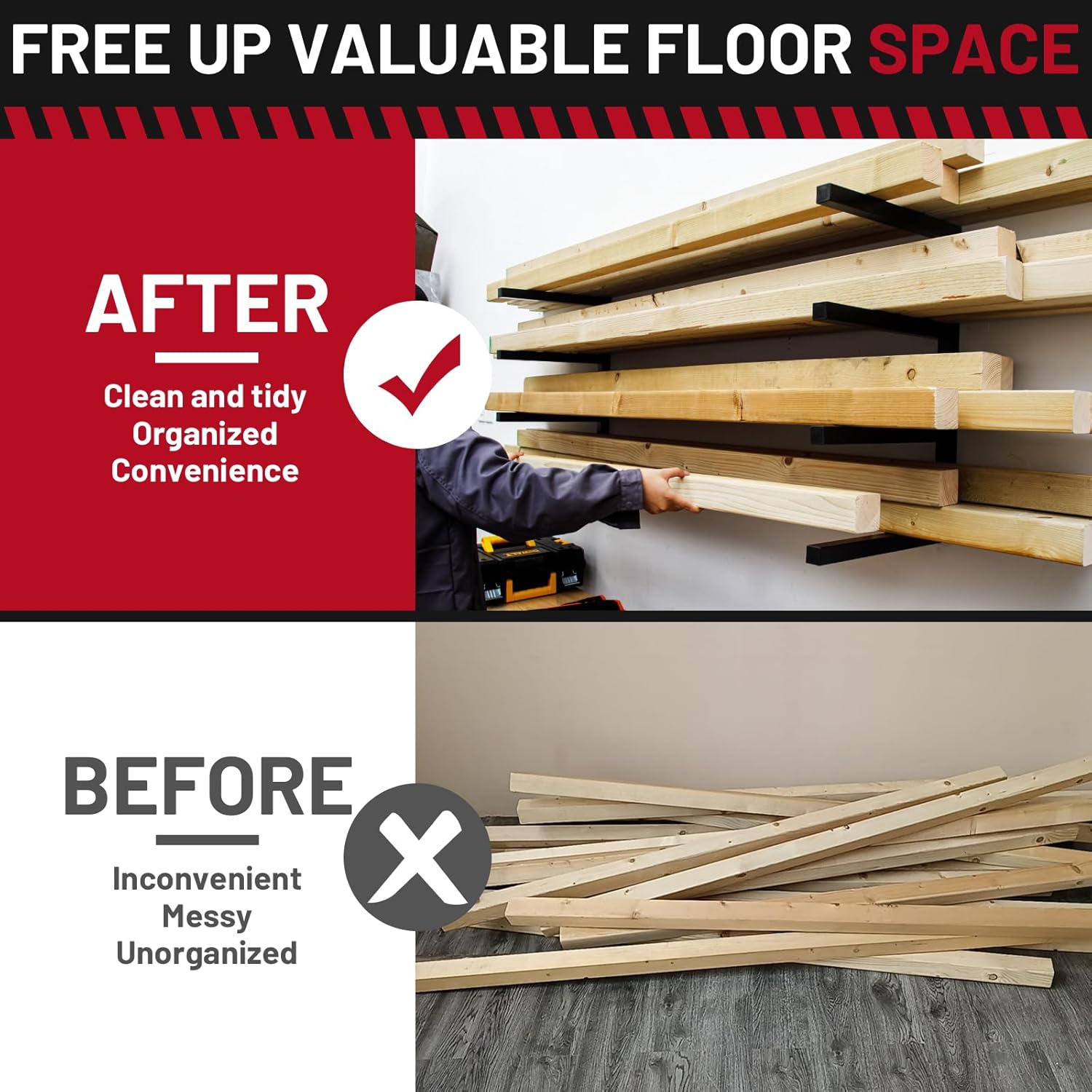 - 【Weight Capacity of 800 LBS】Our lumber rack wall mounted is made of powder-coated 1⅙” (3 cm) steel tube construction。After many tests, each shelf can hold up to 200 lbs, which means a total weight capacity of 800 lbs.