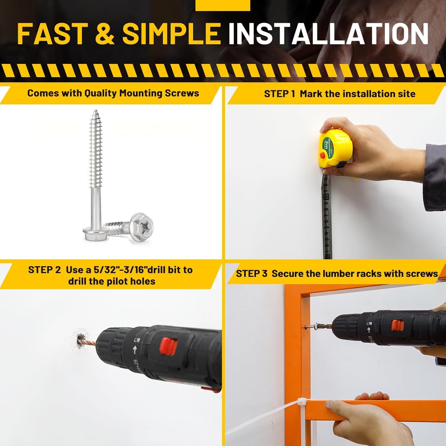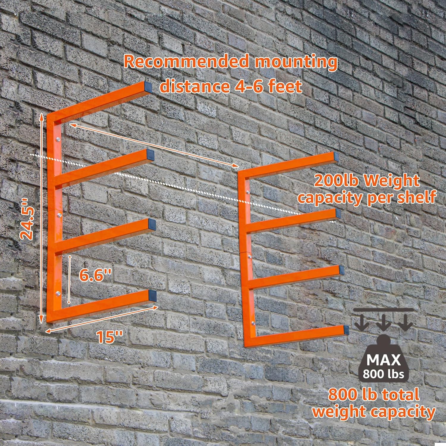 - 【Weight Capacity of 800 LBS】Our lumber rack wall mounted is made of powder-coated 1⅙” (3 cm) steel tube construction。After many tests, each shelf can hold up to 200 lbs, which means a total weight capacity of 800 lbs.