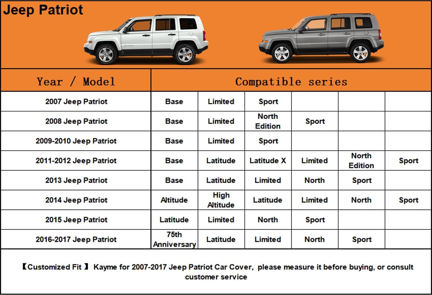 - 【Suitable for】— Custom fit for Jeep Patriot (2007-2017). Come with a large enough portable bag to store your cover when you do not use