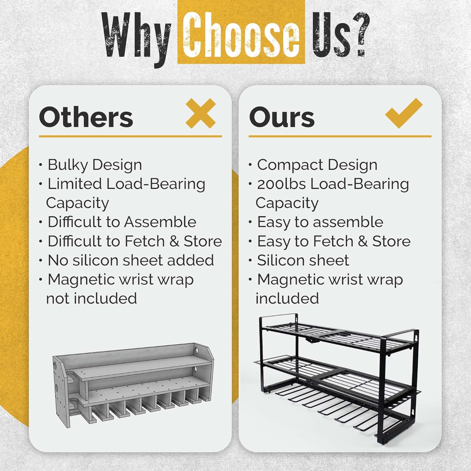 - ππππππ πππ πππππππππ ππππππ: Constructed from heavy-duty alloy steel, this Power Tool Storage Rack is built to last. It features superb welding that allows it to support up to 190 lbs, ensuring it remains reliable, eliminating any concerns about the rack detaching from the wall.