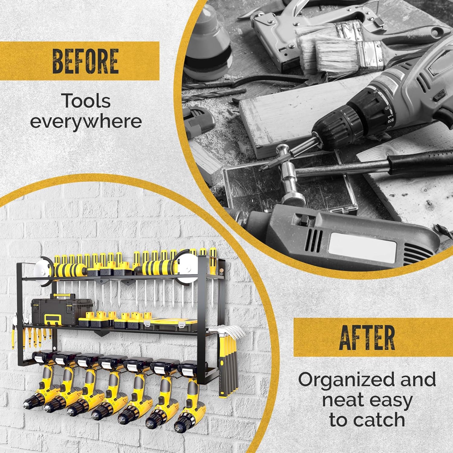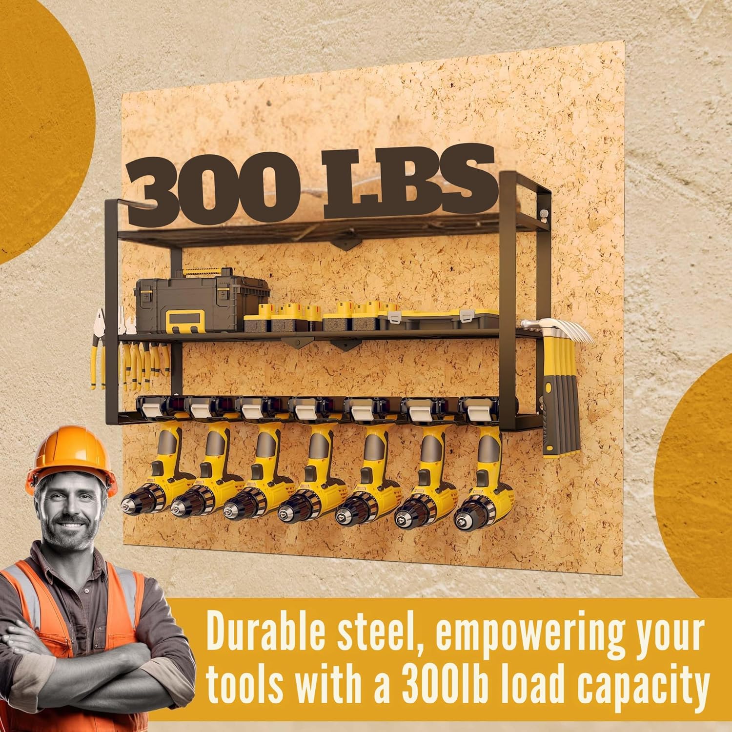 Power Tool Organizer Wall Mount 3 Tier 7 Drill Holders support up to 300Lbs - Metal Cordless Garage Wall Organizer for Cordless Drill, drill holder Rack Suitable for workshop organizers and storage