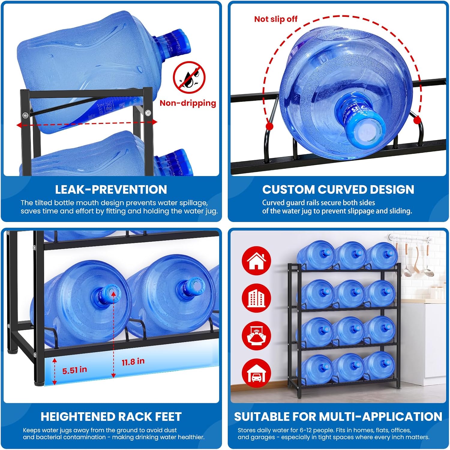jolybebe 5 Gallon Water Jug Holder for 12 Bottles Without Wobbling, New Upgraded Heavy Duty 4 Tier Thicken Water Bottle Storage Rack for Home, Office, Kitchen, Warehouse, Garages Black