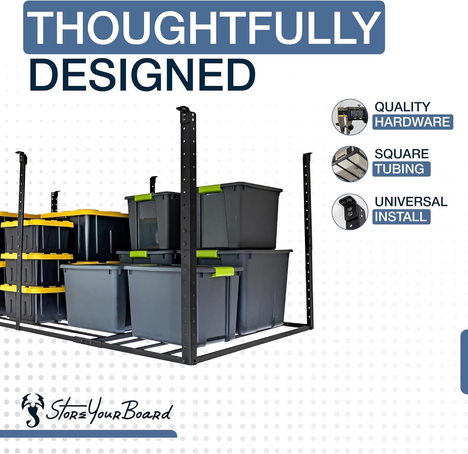 - Designed In The USA: Proudly engineered and tested by the StoreYourBoard design team in Troy, Virginia. Built to organize your garage and built to last!