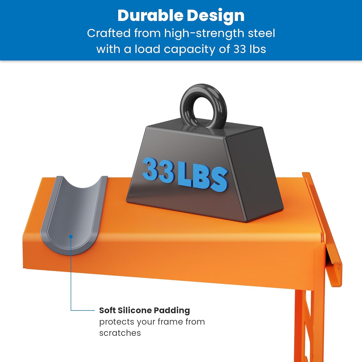 - STABLE AND SECURE: Designed from high-strength steel, this bicycle wall hanger offers a sturdy and safe storage solution for your bike. With a weight capacity of 33 lbs it is compatible with most racing bikes, MTB and more. A bonus wheel strap prevents your front-wheel from touching the wall. Installation is a breeze - all hardware for installation on solid walls or wood studs is included with this hanging bike rack.