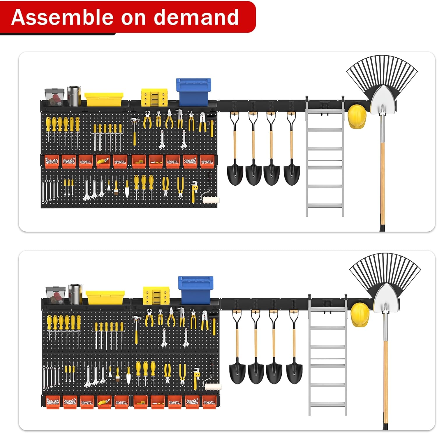 - MULTIFUNCTIONAL & HANDY—This garage pegboard wall organizer includes 4PC*Pegboard, 6PC*Steel Rail, 2PC*Shelf, 4PC*Small J Hook, 2PC*Short Multi-Purpose Hook, 1PC*Single Hook, 10PC*Garage Storage Bin, 43PC*Mini Hooks. Different styles of hooks meet your diverse needs. Quickly and easily snaps securely into place on mounting rails (included) with provided locking gripper.