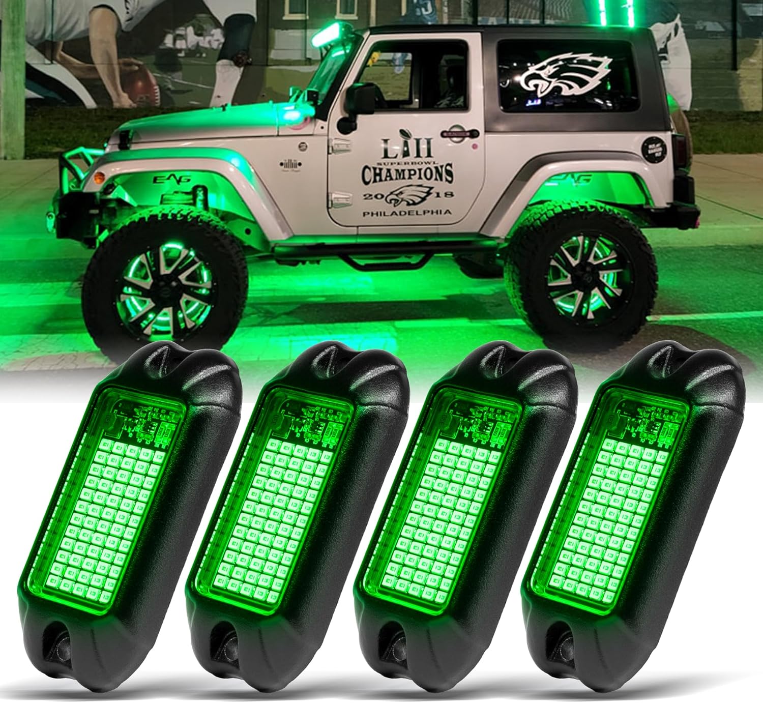 Nicoko 4Pods Pure Green LED Rock Lights 72w high Power Rock Lights Neon Underglow Light for Car Trucks ATV UTV SUV Boat Underbody Glow Trail Rig Light IP68 Waterproof