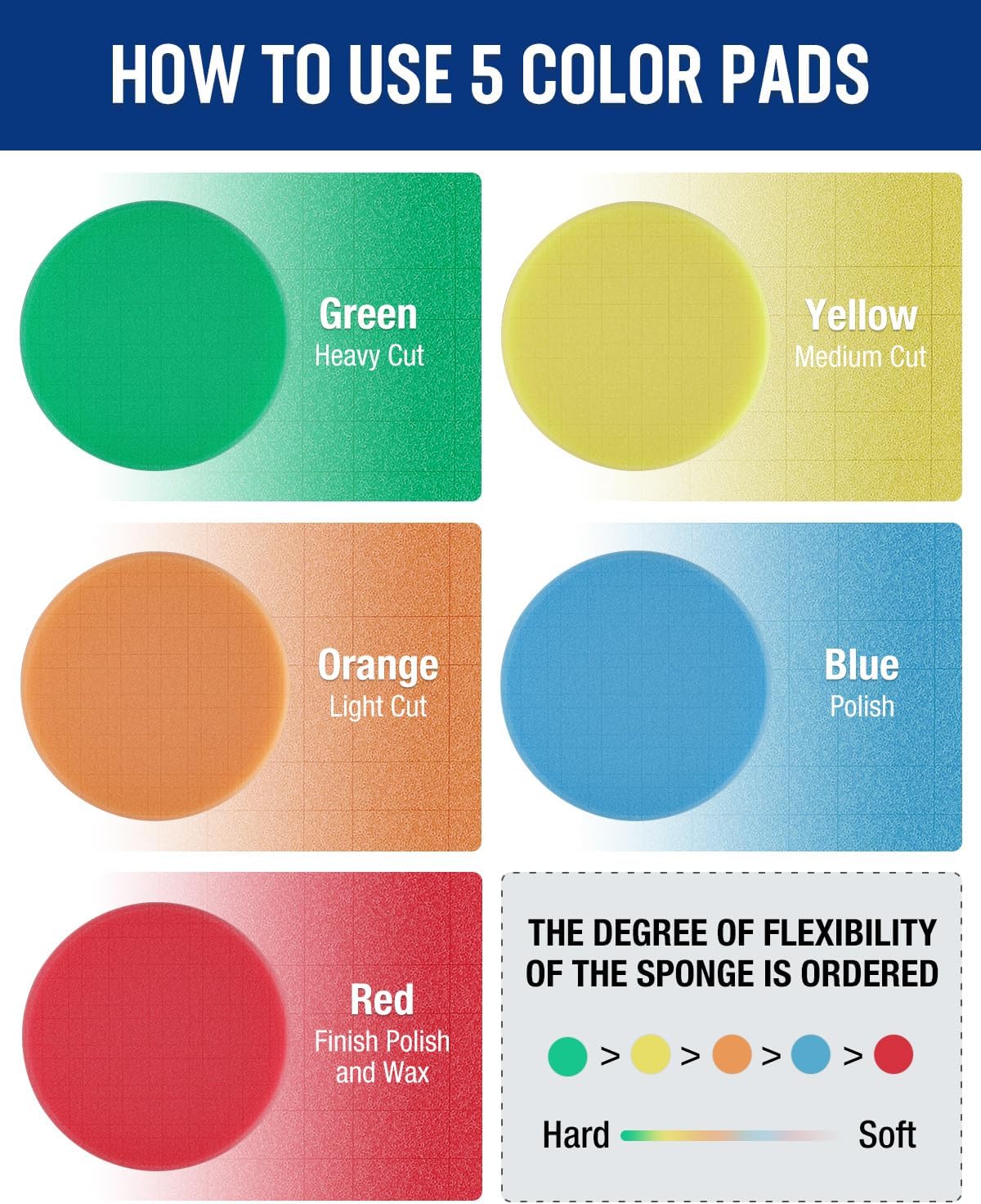 - Compounding & Polishing & Waxing: Available in five colors, these sponge pads are ideal for various tasks: Green for heavy compounding, Yellow for medium polishing, Orange for light polishing, and Blue and Red for final polishing and waxing. They effectively remove sun damage, car scratches, and headlight wear. Green tackles oxidation coatings and mild scratches, Yellow handles sun damage and swirl marks, Blue polishes, and Red finishes with waxing