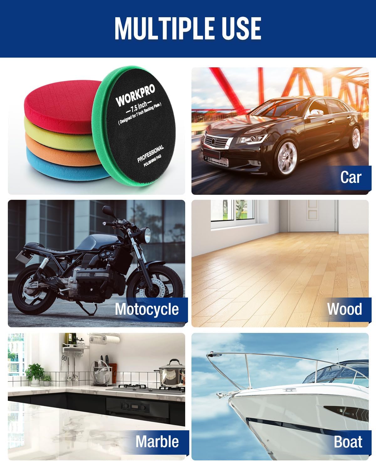 - Product Dimensions: The WORKPRO buffing polishing pads have a diameter of 7.48 inches/190mm and a thickness of 1.18 inches/30mm, suitable for a 7-inch backing plate. They are professional polishing pads