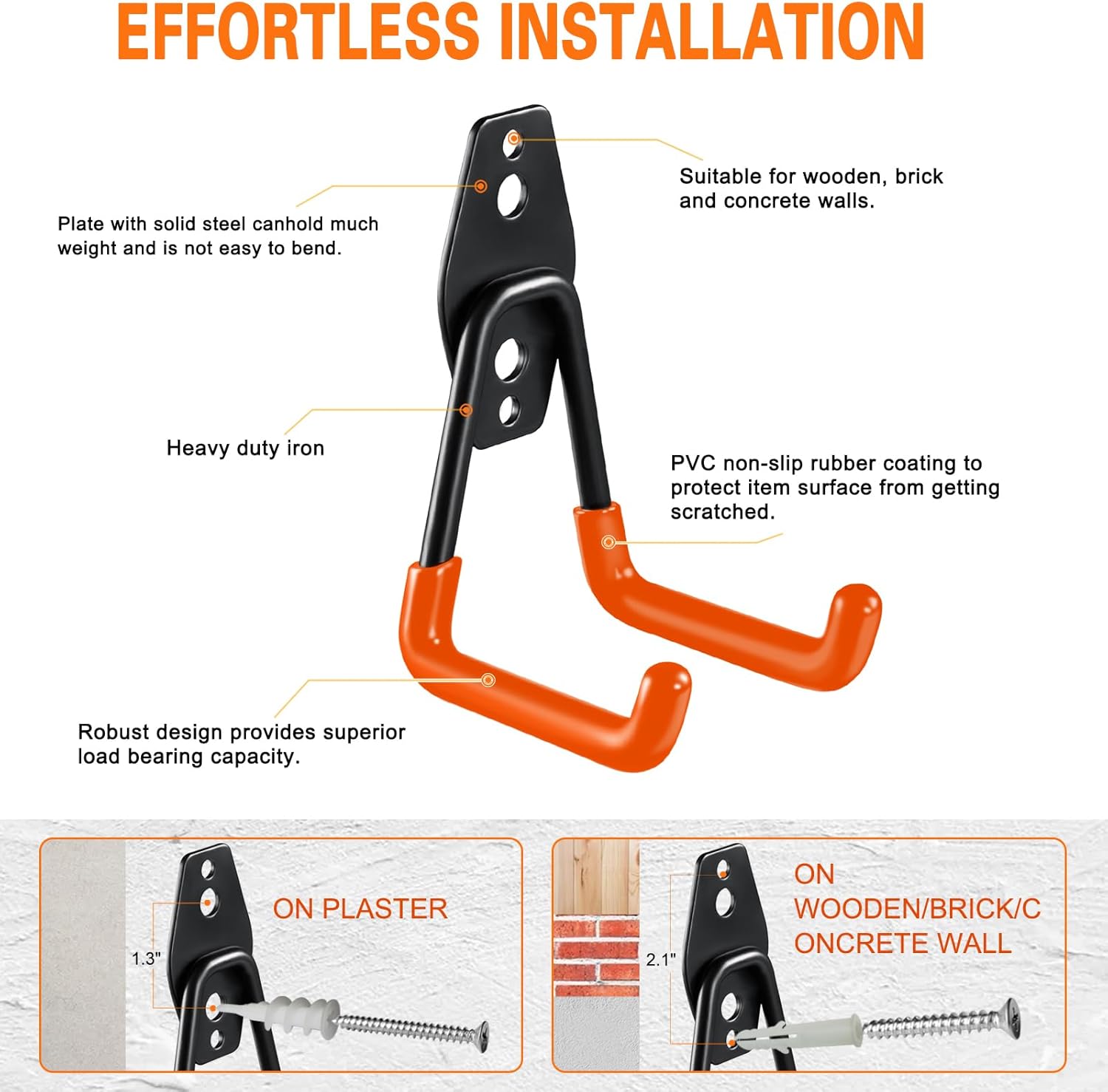 - Easy Installation: The garage hooks come with two types of screws, including 12 sets of screws and wall plugs, to accommodate different wall surfaces. Depending on your storage needs, you can install the garage wall hooks on brick, concrete, wood walls or drywall.