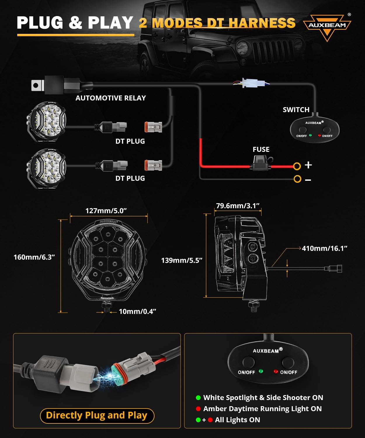 - 【Trustworthy Brand Guarantee】Choose Auxbeam to join a legacy of trusted performance and rugged dependability. 𝐖𝐡𝐚𝐭'𝐬 𝐢𝐧 𝐭𝐡𝐞 𝐛𝐨𝐱 [2* round offroad lights, 2* black covers, 1* DT wiring harness, 1* mounting kit, 1* user guide, 1* sticker.] 24-month guarantee and 24/7 customer support, we're always here to be your backup.