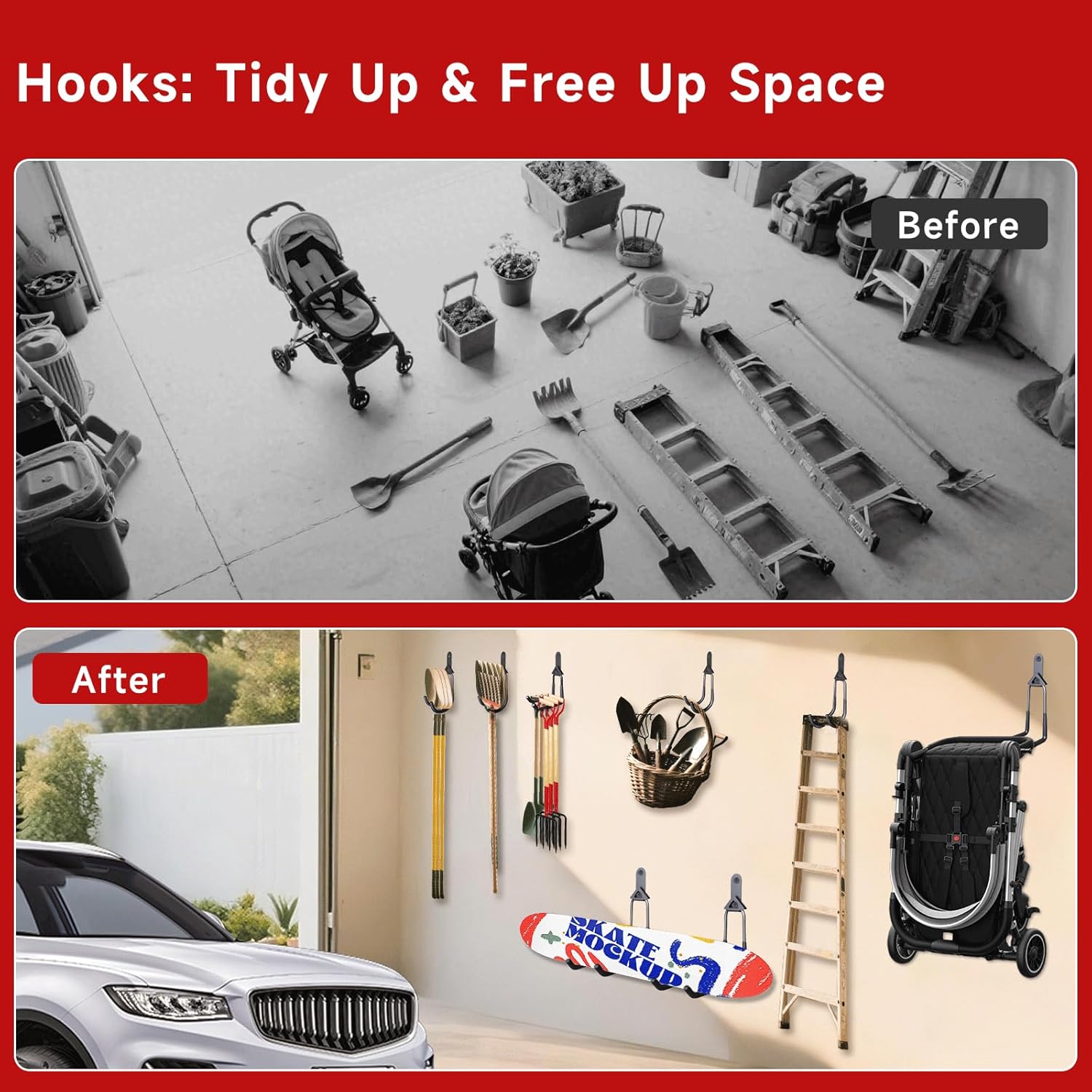 - EFFICIENT STORAGE FUNCTION: Design with double hooks, utilize the vertical storage method to create additional space, the garage wall hooks can be used wherever you need, such as garage, shop, shed, garden, warehouse, basement, ect. Perfect garage wall hooks to keep everything organized and clear at a glance.