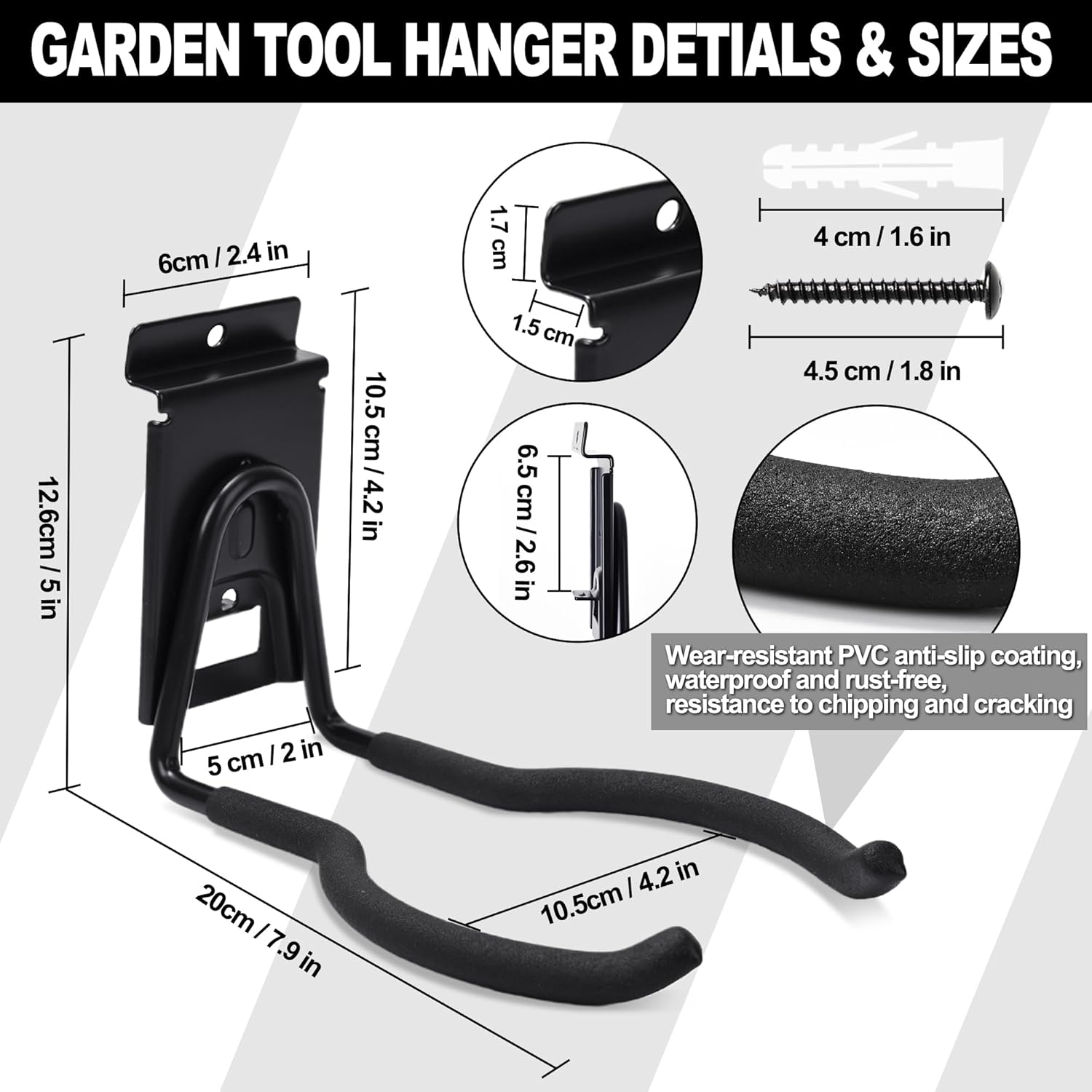 - 【MULTIPURPOSE GARAGE TOOL HANGER】Mount it in your garden, yard, shed or garage as you wish. Perfect for hanging power tools especially like string trimmers, weedeaters, power drills, gas edgers, chainsaws, blowers and lawnmowers, or garden tools like shovels, ladders, mops, brooms, hoses, snow shove or any hangable items.