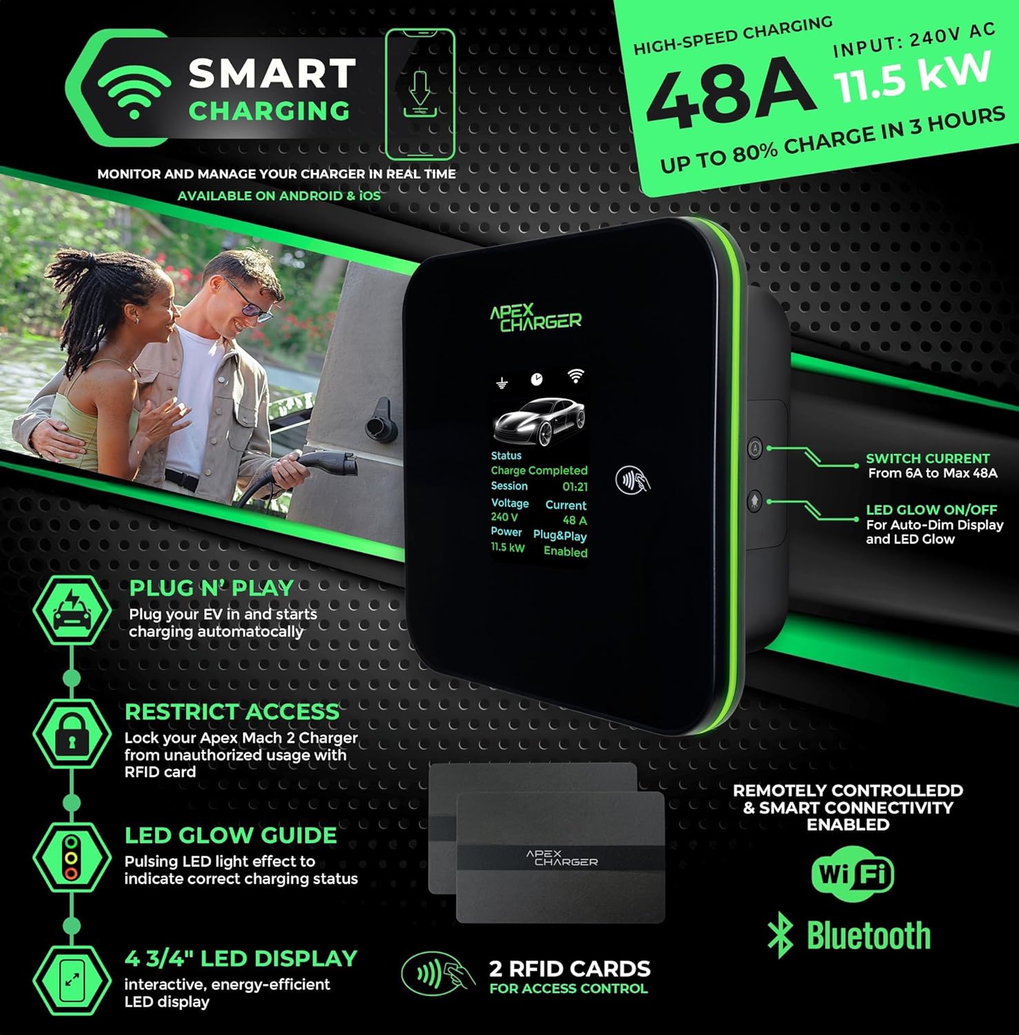 - EV charger level 2: a fusion of utility upgrades: 240v & 11.5KW of power. Bluetooth & Wi-fi enabled, electric car charger, 2 RFID cards, the True Plug N' Play function, mobile smart app, connectors holder, 4 3/4" LED display panel with standby function for energy saving and the 24h Apex Charger post sales stellar customer support, all included