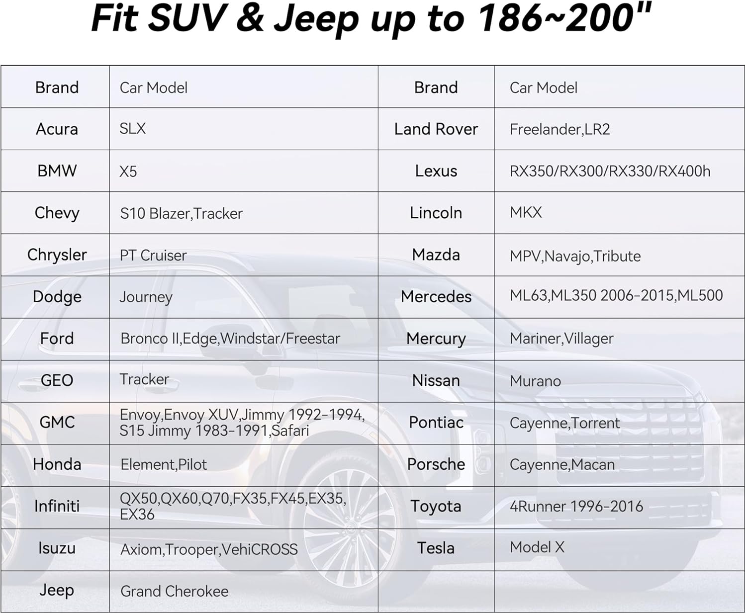 - 【Choose the Right Model】Universal fit for SUV which length is up to 200 inch.See the product images for applicable vehicle models.The universal car cover comes with a storage bag,you can store it easily when not used.