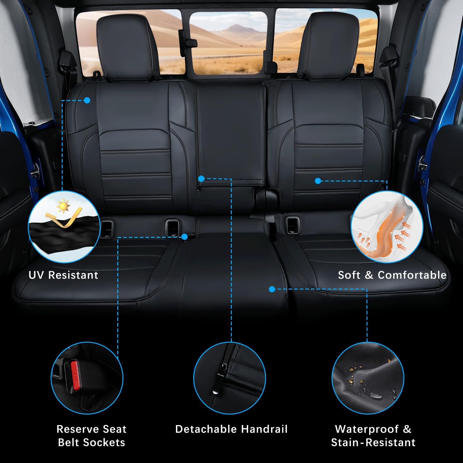 - High-Quality Craftsmanship: Our seat covers are meticulously crafted from premium faux leather, ensuring a soft, durable, waterproof, and scratch-resistant protection for your Jeep Gladiator's seats.