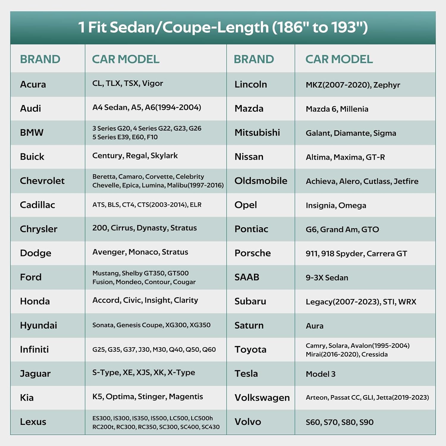 - 【CHOOSE THE RIGHT MODEL】: Molebt car cover fits Sedan & coupe 186 to 193 inch. For example Ford Mustang, Chevy Camaro, Chevelle Corvette C3 C4 C5 C6 C7 C8, Toyota Camry, Honda Accord/Civic, Kia Optima/K5/Stinger, Volvo S60, Nissan Altima/Maxima, Hyundai Sonata, Ford Fusion, Lexus ES350, Volkswagen Passat, Infiniti G35/G37, Tesla Model 3.