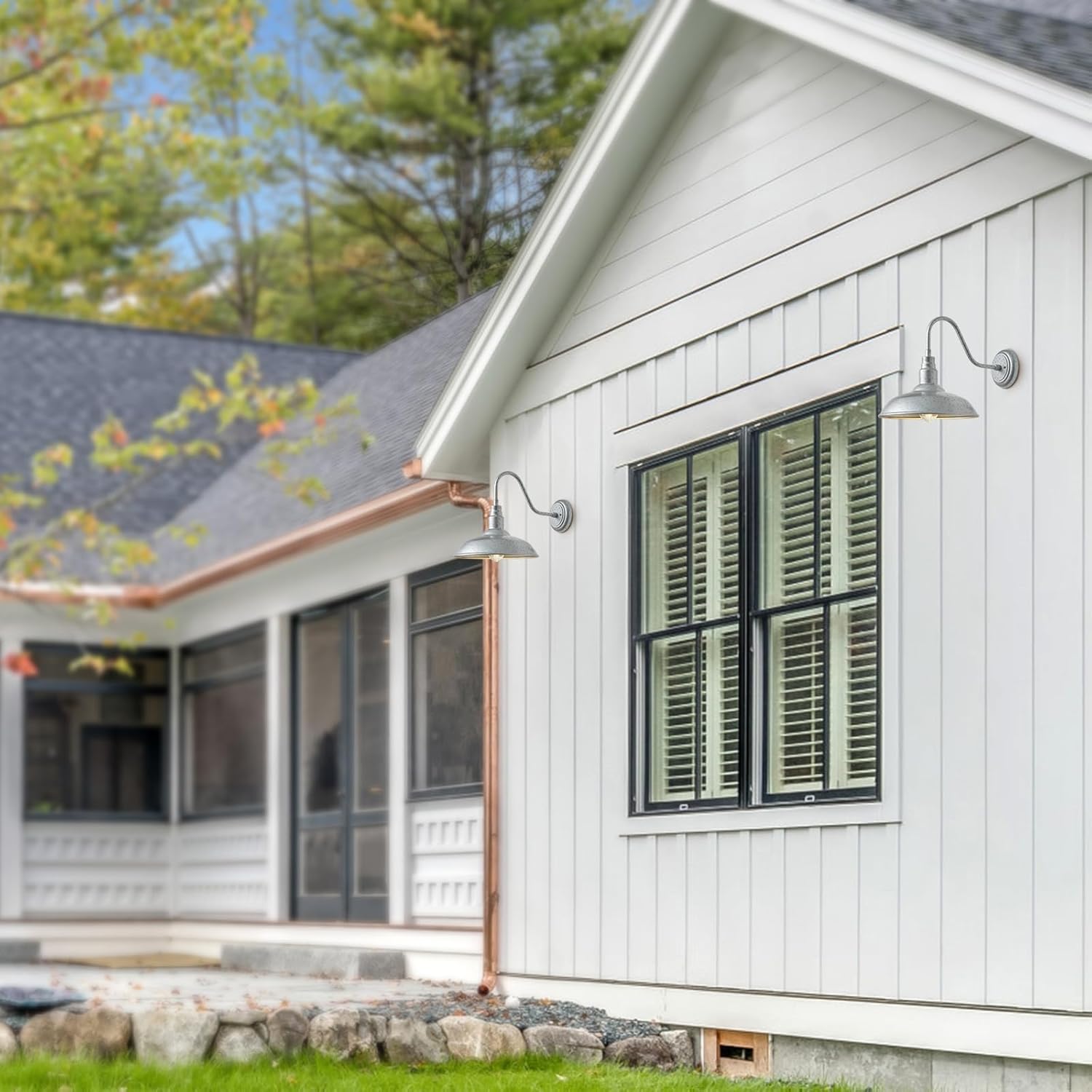 - Outdoor Light Fixture Makes Your House Look Unique Stylish: Featured with its retro goose neck arm and simple 14 inch dome design, finished by a high-tech galvanized powder coating process, this farmhouse exterior gooseenck light brings a pleasing and simplistic elements to both exterior and interior place. The open bulb area of this sconce also spreads the light farther, meeings the illumination needs for your farmhouse, cabin, garage, doorway, garden, yard, front and back porch