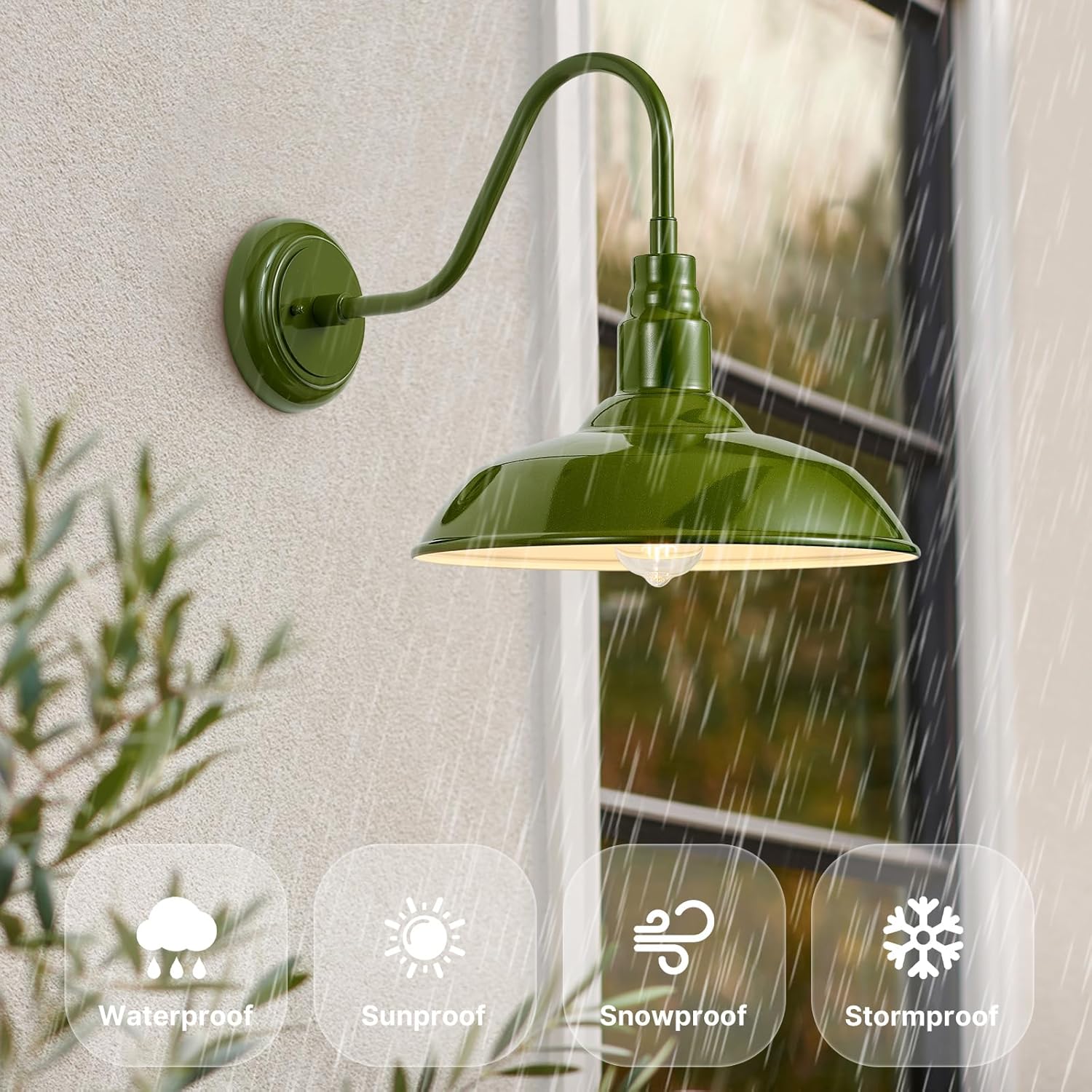 - Outdoor Light Fixture Makes Your House Look Unique Stylish: Featured with its retro goose neck arm and simple 14 inch dome design, finished by a high-tech green powder coating process, this farmhouse style barn light brings a pleasing and simplistic elements to both exterior and interior place. The open bulb area of this sconce also spreads the light farther, meets the illumination needs for your farmhouse, cabin, garage, doorway, garden, yard, front and back porch