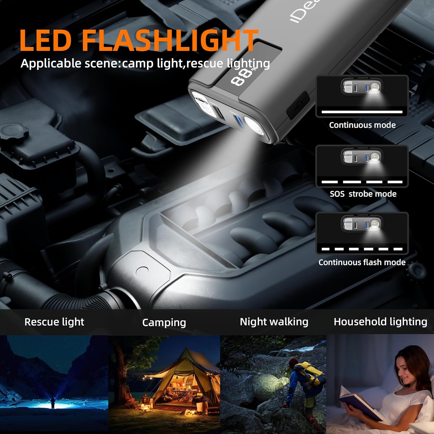 - POWERFUL AND LARGE CAPACITY - IDEAPLAY Battery Jump Starter provides 2000A peak current with 20000mAh large capacity which can jump start up to 8.0L Gas or 7.0L Diesel 12V cars (Including hybrid and electric cars), Motorcycles, ATVs, UTVs, RVs, Boat, Truck, Lawn Mowers, Snowmobiles and etc. J10 supports up to 40 times on a full charge and the standby time is up to 6 months.
