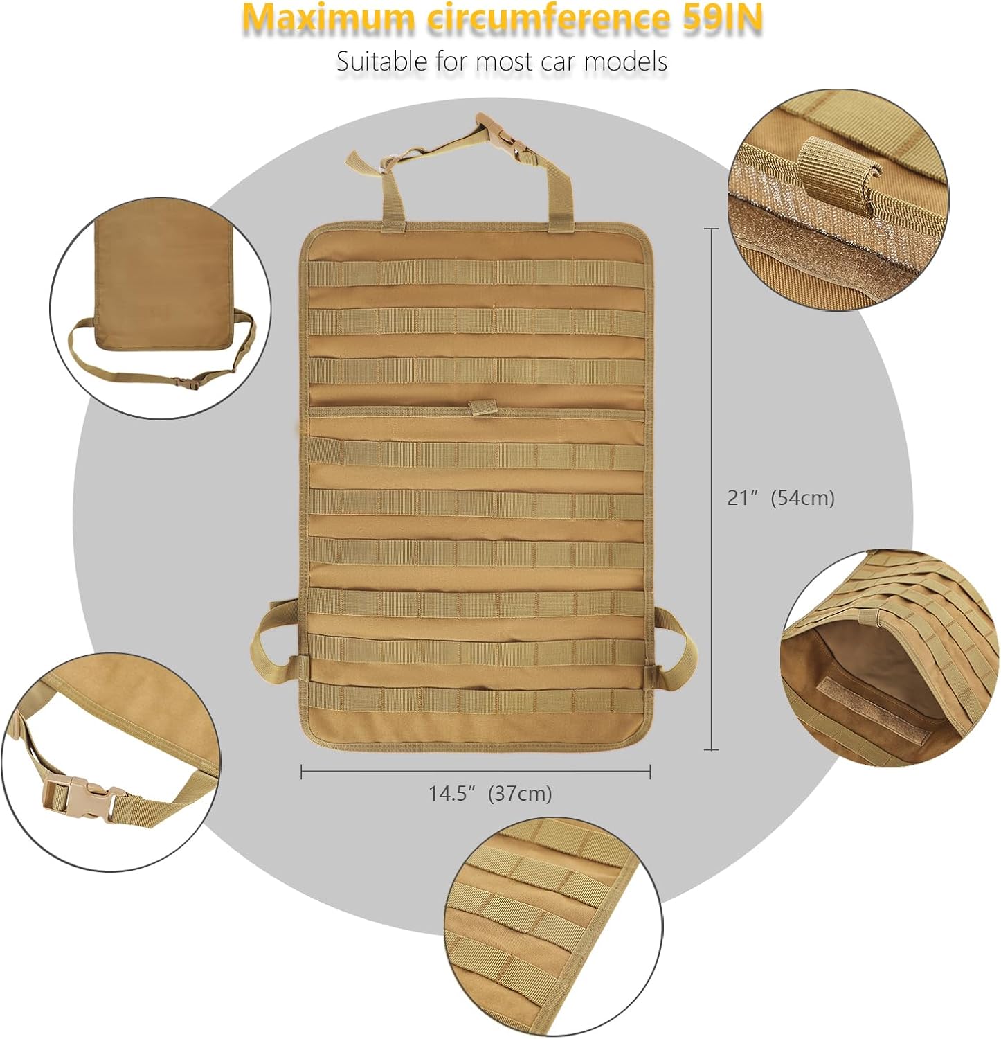 - 🚗 Multifunctional Storage - Design with 5 Molle bags on the back to help you store tactical gear & personal items and save space. Difference sizes of Molle bags help you classify your items so easily.you can set the Tactical Seat Back Organizer according to your own habits and need.