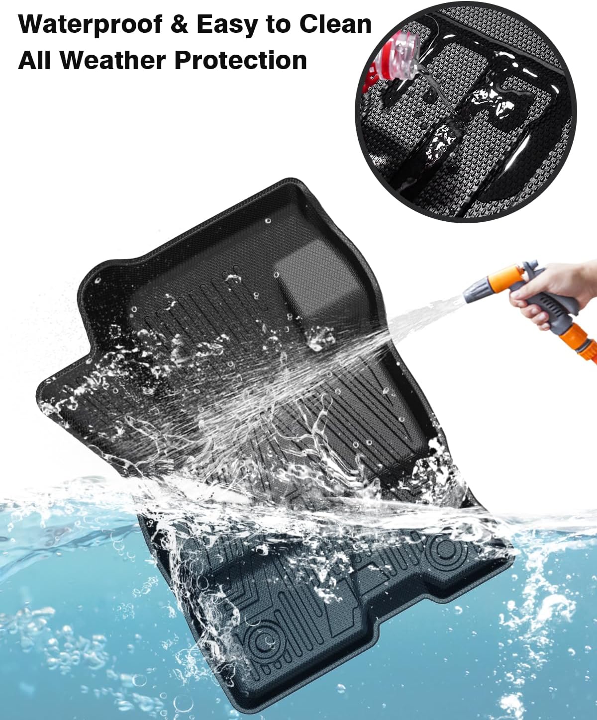 - All Weather Floor Mat&Bed Liner: These floor liners&truck bed mat offer protection against outside variables (such as mud, liquid and snow) and will prolong the life of the car interior in all weather (rain, fog, snow, etc). The floors mats&cargo bed liner are easy to clean by wiping, rinsing, or simply using soap and water.