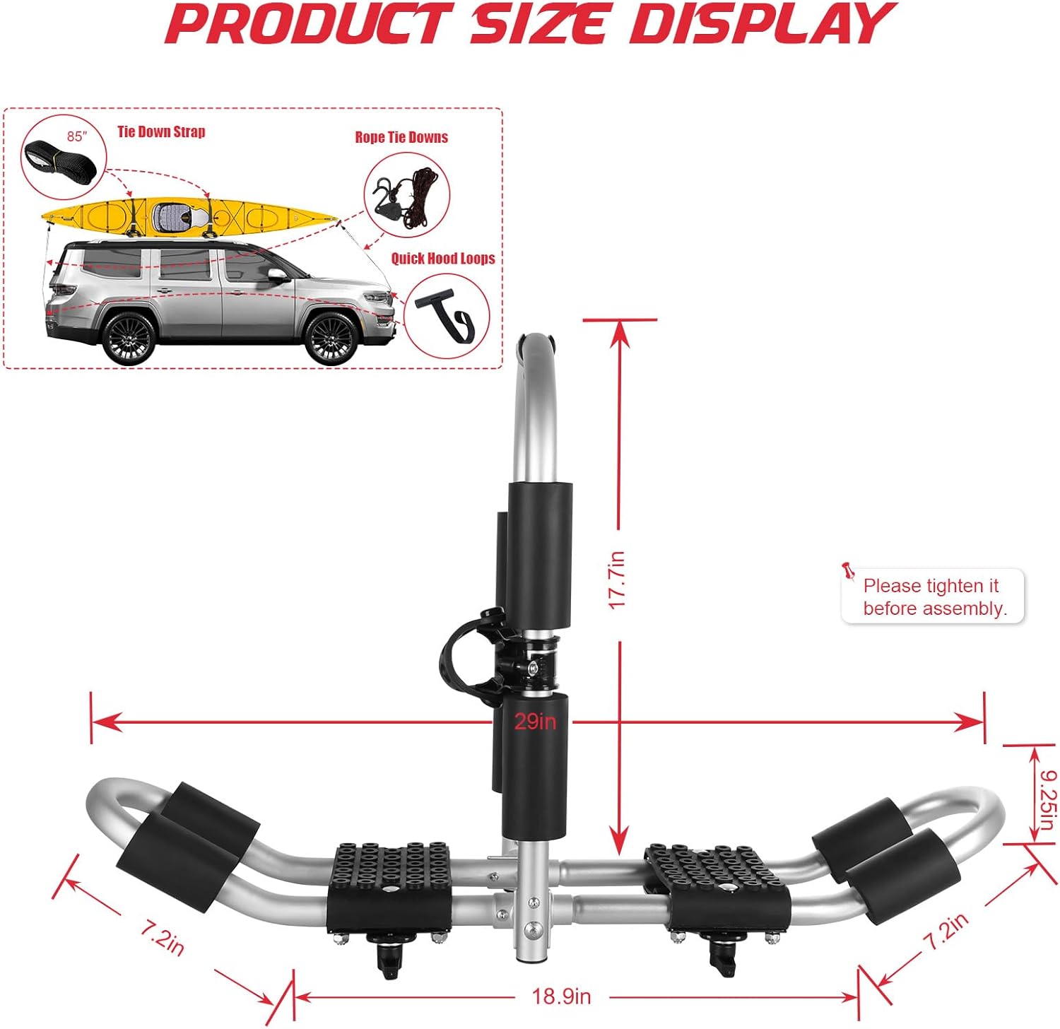 - 【Perfect Accessories】With 4 ratchet belts, 4 10ft S-hook ratchet pulleys straps, and 4 anchor belts, you can carry your kayak anywhere with confidence. In addition, we have specially designed the position for the paddle, so you don't have to put any accessories in the car.