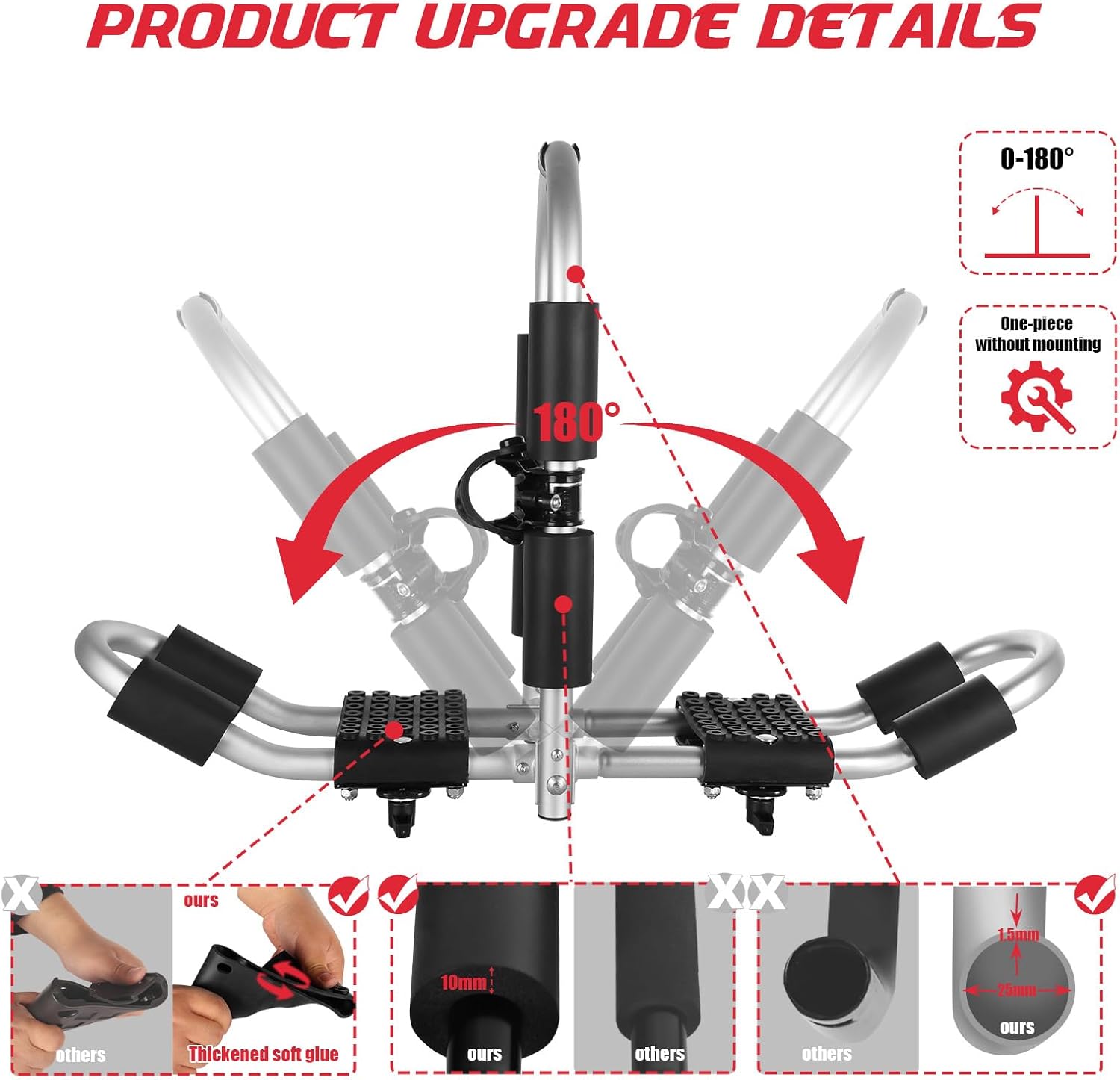 - 【Upgrade Thicken Design】The FORWODE frame is made of aero-grade aluminum using an anodized process. The thickened tube wall (2mm) and diameter (25mm) make the roof frame light and strong. The widened design can support two heavy kayaks up to 180lb. Rust-resistant and corrosion-resistant material features you can keep on the car roof for a long time without removing it.