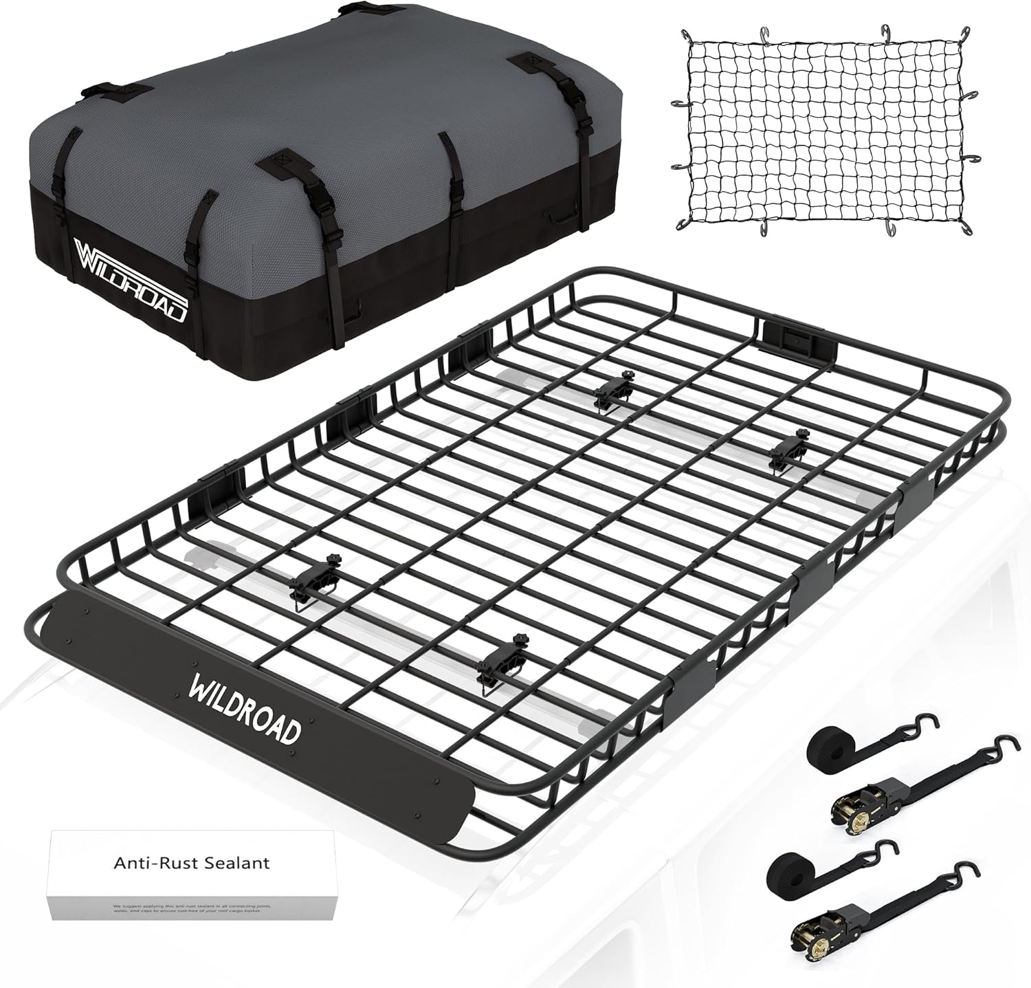 Wildroad Roof Rack Cargo Basket, Upgraded 4” Fence Wide Car Roof Basket Combo, 84"x 50"x 4" Universal Roof Cargo Carrier Basket with Cargo Bag, Cargo Net and Ratchet Straps Fits for SUV Truck Cars