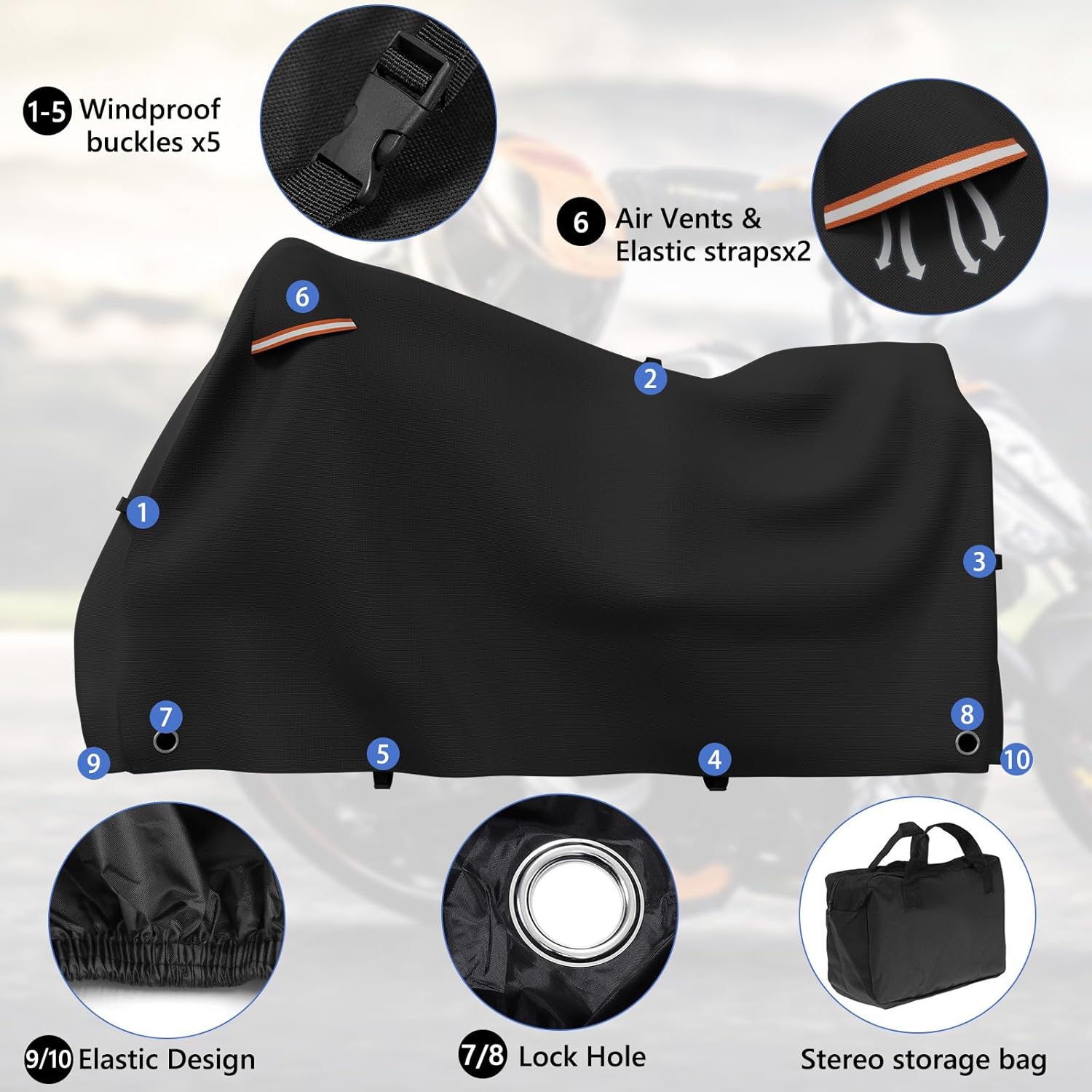- 【Unique Designs】(1) Two air vents prevent moisture under the cover. (2) Waterproof Black PU Coating: UV protection and heat-proof,prevent cracking and aging of inner decoration leather and plastic. (3) Two full Orange Reflective Strips to prevent collisions during the night and depict the body of your motorcycle with a chic look. (4) Antenna openings with Velcro, 2 Anti-theft lock holes(No locks) and a stereo storage bag.