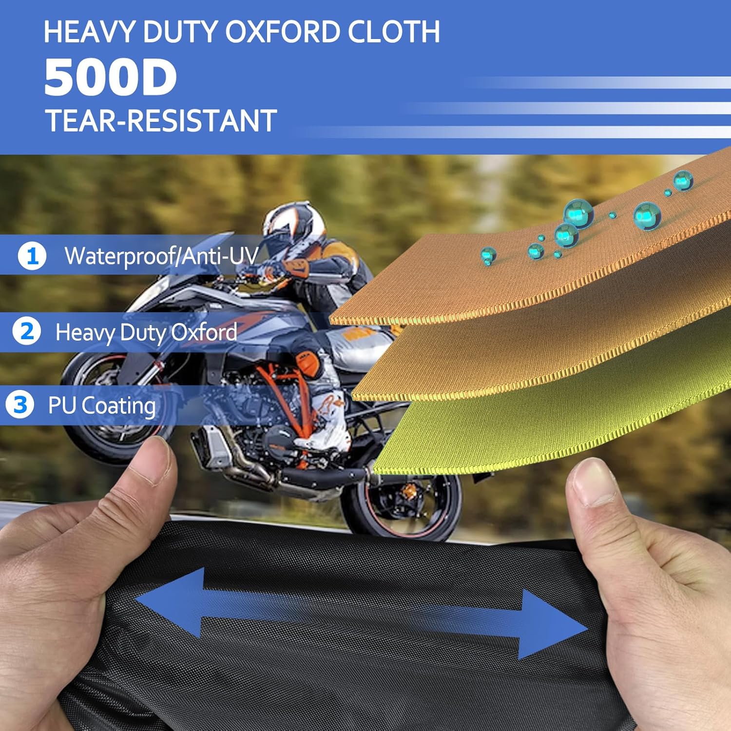 - 【Greater Material】The motorcycle covers are made of premium 500D oxford cloth with PU coating, harley davidson motorcycle cover are durable and waterproof, no more worry about the sunlight, rain, snow, wind, dust, resin, leaves, debris and bird droppings.