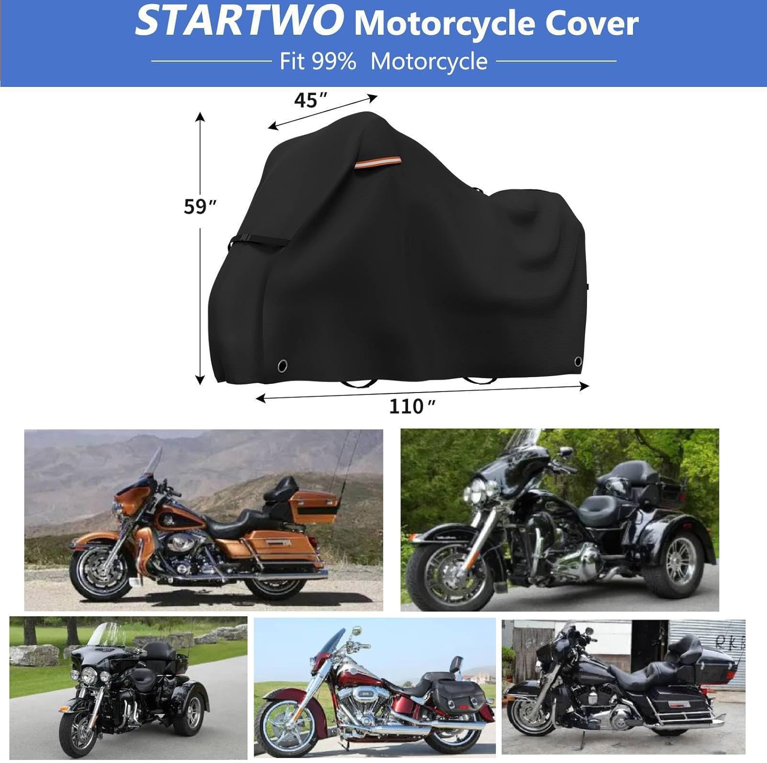 - 【Cover Size】This motorcycle covers measures 110"L x 45"W x 59"H. Suitable for most motorcycle of conventional models. Our motorcycle storage cover are designed for Harley-Davidson touring models, including Road King, Electra Glide, Street Glide, Road Glide and CVO Version. Please confirm your motorcycle model before purchasing.