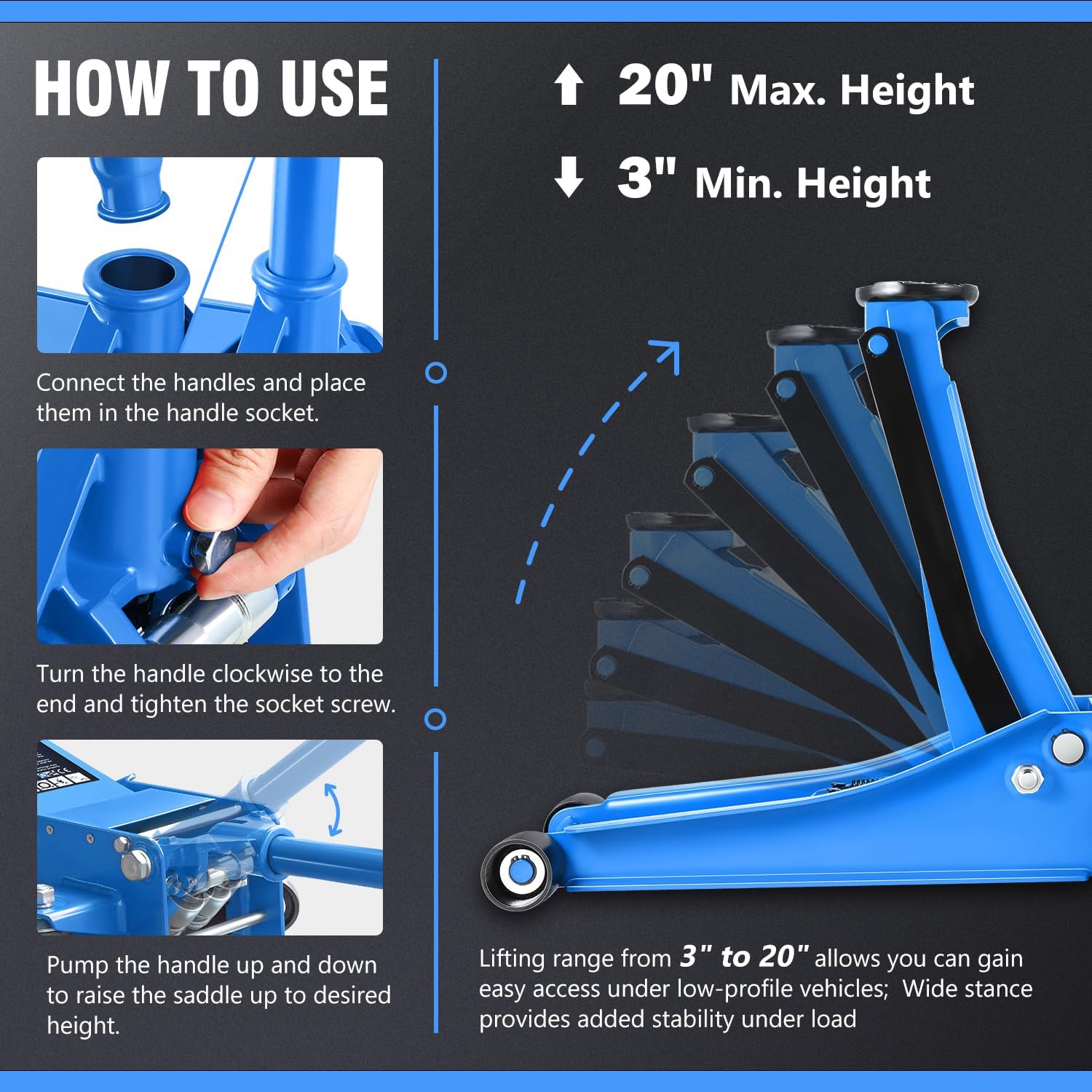 - SPEEDY LIFT GARAGE JACK - This Hydraulic Floor Jack features a 3 ton (6,000 lb) capacity with a min lifting height of 3" and a max height of 20". Dual piston pump allows you to easily lift the jack up to desired height. It is great for garage service and heavy-duty industrial use.