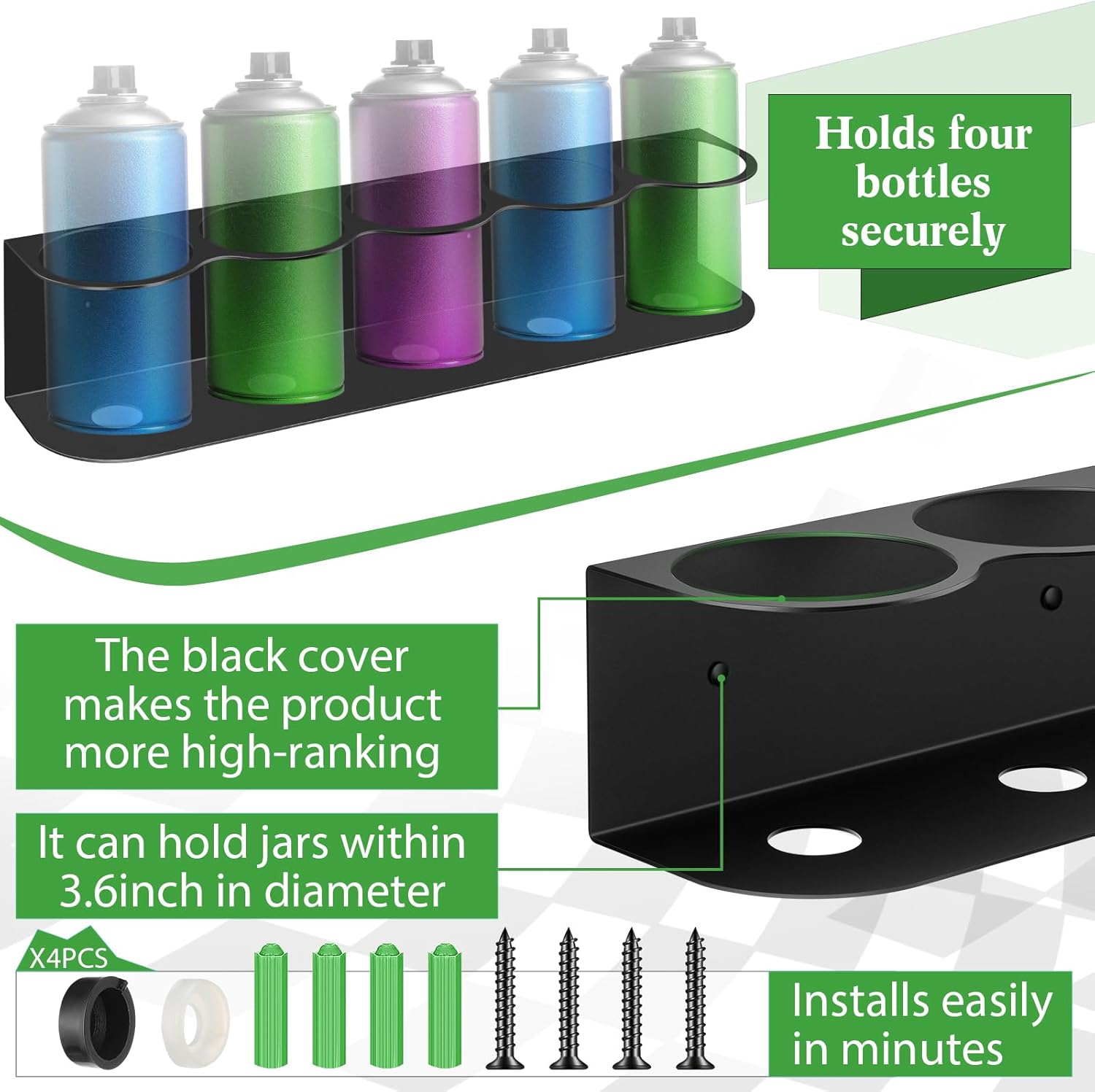 - Durable Material and Stable Construction: made with sturdy steel with powder coated in surface, this spray can holder is built to last; The material is tough, ensuring that it can withstand wear and tear from regular use; With its solid construction, you can be sure that your bottles will be secure and safe in the holder