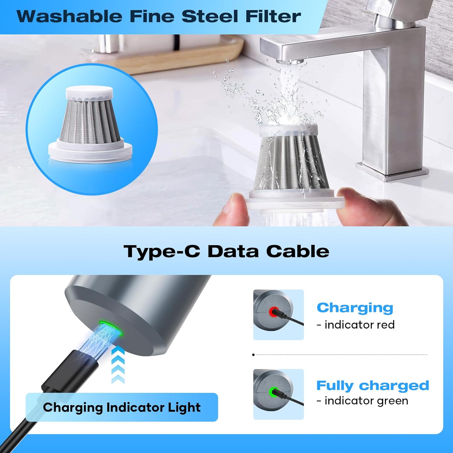 - 【HEPA Filter】The handheld vacuum cleaner is equipped with two different filters. The HEPA filter can be washed and can be used for 2-3 months. The upgraded fine steel filter can be used again with a simple wash, and the service life can be more than 1 year.