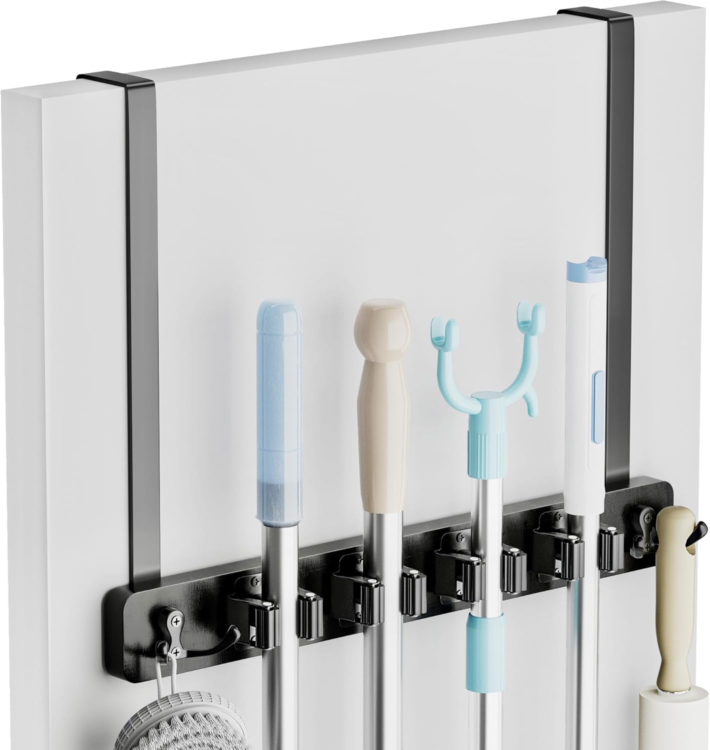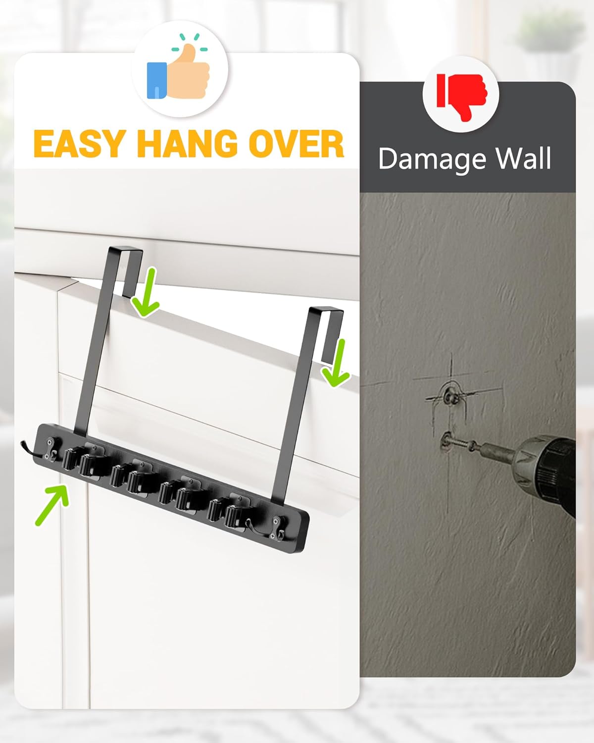 - Wide Range of Uses, Ideal Gift: Step away from traditional broom holder door mount. Simply place door broom holder organizer over the door. Our over the door broom and mop holder maximizes space without compromising style, effortlessly organizing brooms, mops, towels, and brushes in the laundry room, garage, bathroom or kitchen. With its aesthetic appeal and practicality, it's a thoughtful gift for occasions like Father's Day, Mother's Day, or for husband, wife and grandparents.