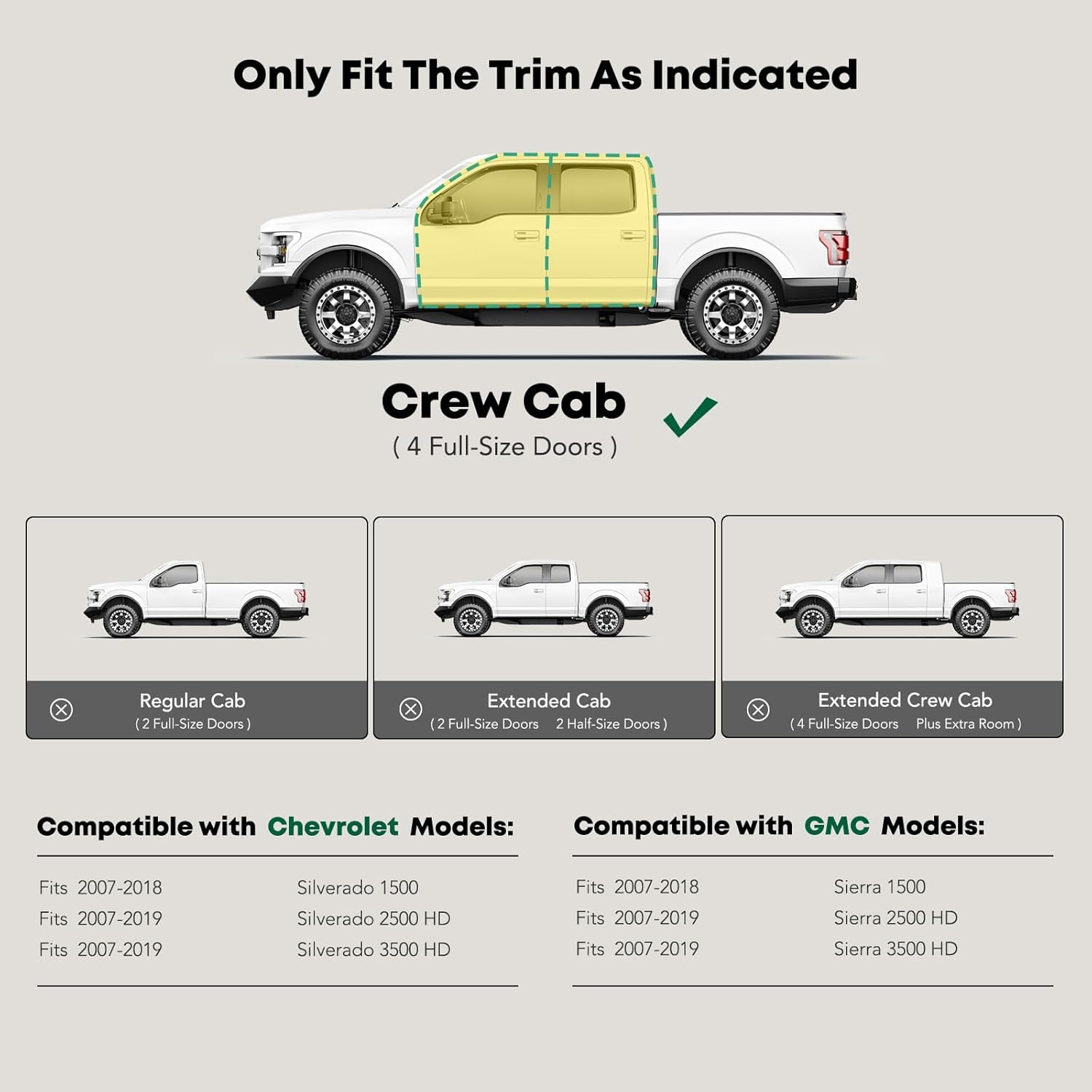 - Confident Fitment: Our side steps are compatible with Chevrolet and GMC Models: Silverado/Sierra 1500 2007-2018, Silverado/Sierra 2500 HD 2007-2019, Silverado/Sierra 3500 HD 2007-2019---Crew Cab(4 Full Size Doors) only; Not fit Extended/Double Cab(2 Full-Size Doors & 2 Narrower Doors) or Standard/Regular Cab(2 Doors), Not fit Classic & C/K Models