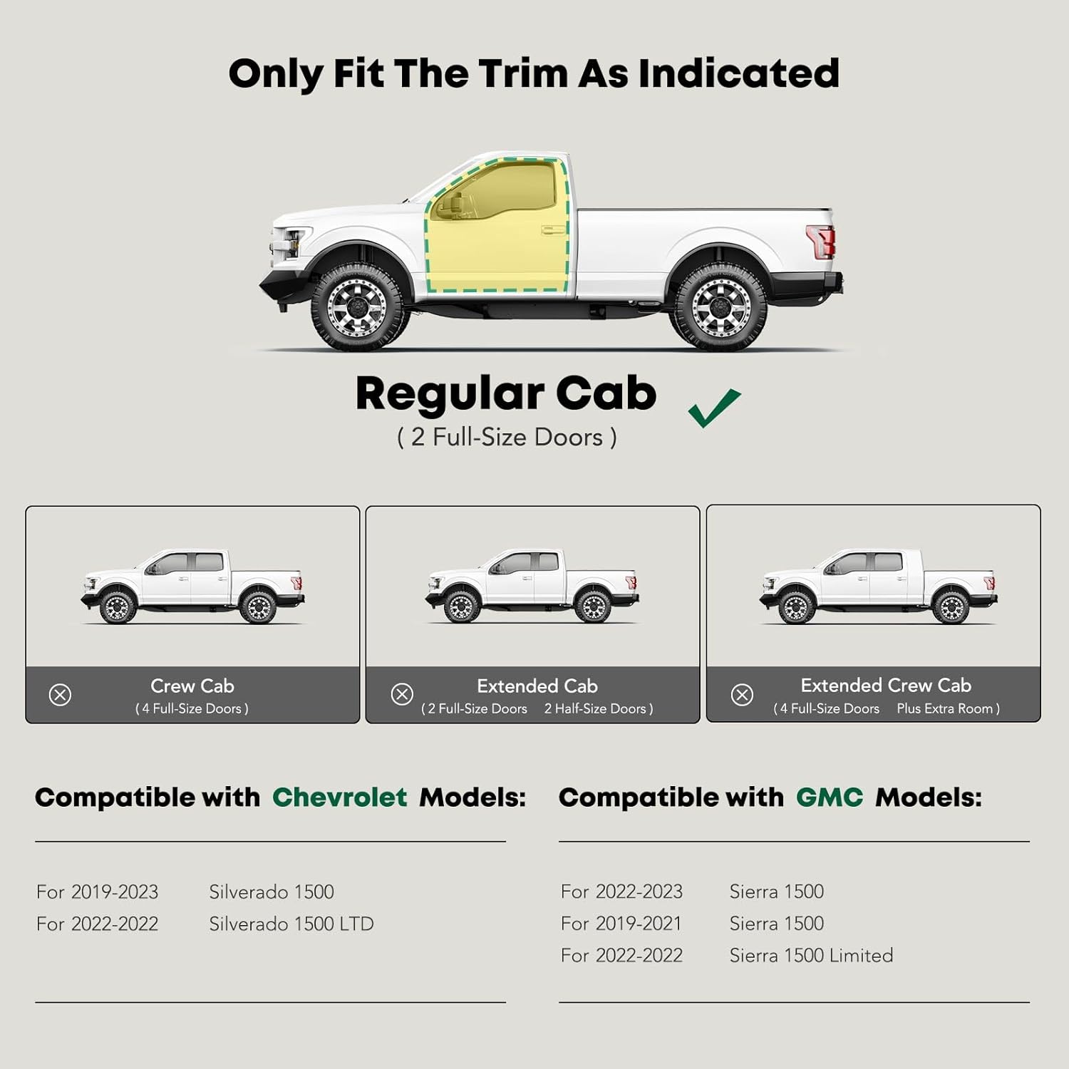 - Confident Fitment: Cab length side steps are compatible with the Chevrolet and GMC Models: Silverado/Sierra 1500 19-24, Silverado 1500 LTD/Sierra 1500 Limited 22, Silverado/Sierra 2500 HD & 3500 HD 20-24, Standard/Regular Cab(2 Full-Size Doors), Excluding 2019 1500 LD