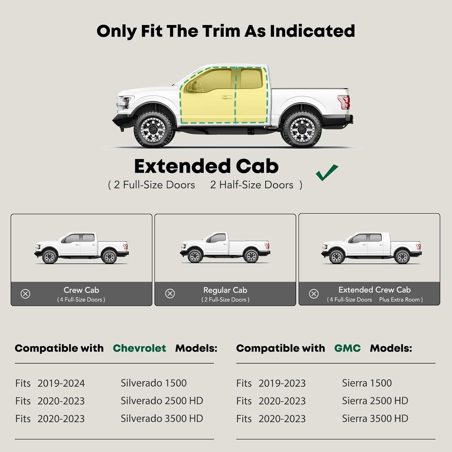 - Confident Fitment: Cab length side steps are compatible with the Chevrolet and GMC Models: Silverado/Sierra 1500 2019-2024, Silverado 1500 LTD/Sierra 1500 Limited 2022, Silverado/Sierra 2500 HD & 3500 HD 2020-2024, Extended Cab(2 Full-Size Doors with Half Doors)