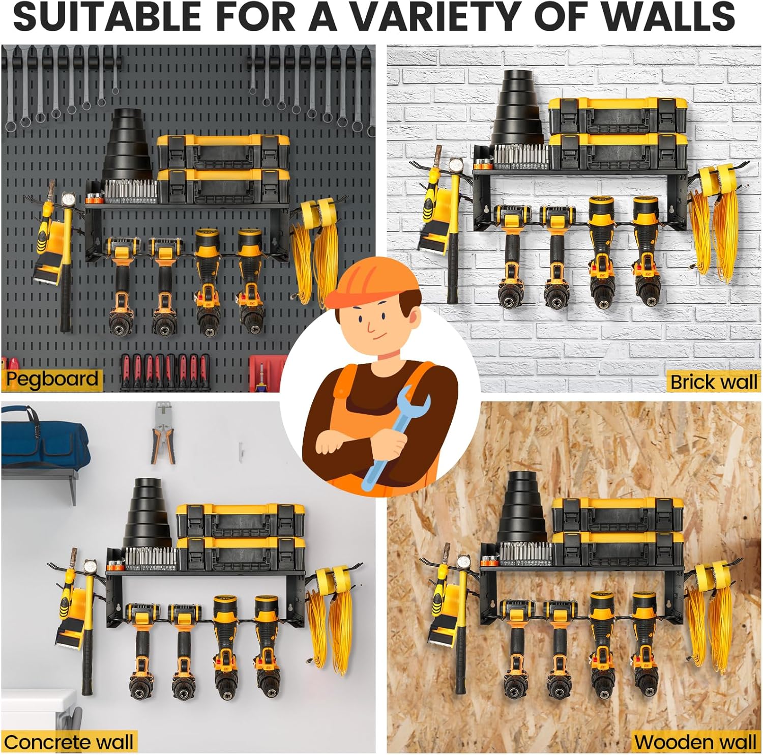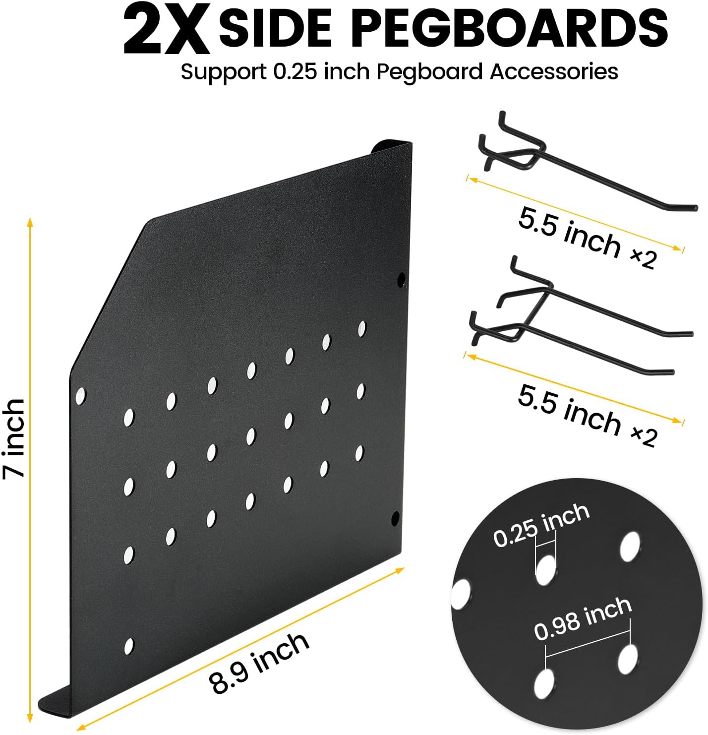 - Versatile Side Pegboards: Hang garage tools such as spanners on 8.9"W × 7"L side pegboards with 4 included hooks, supports 0.25" pegboard accessories for DIY customization, improves load-bearing capacity and stability of the power tool rack