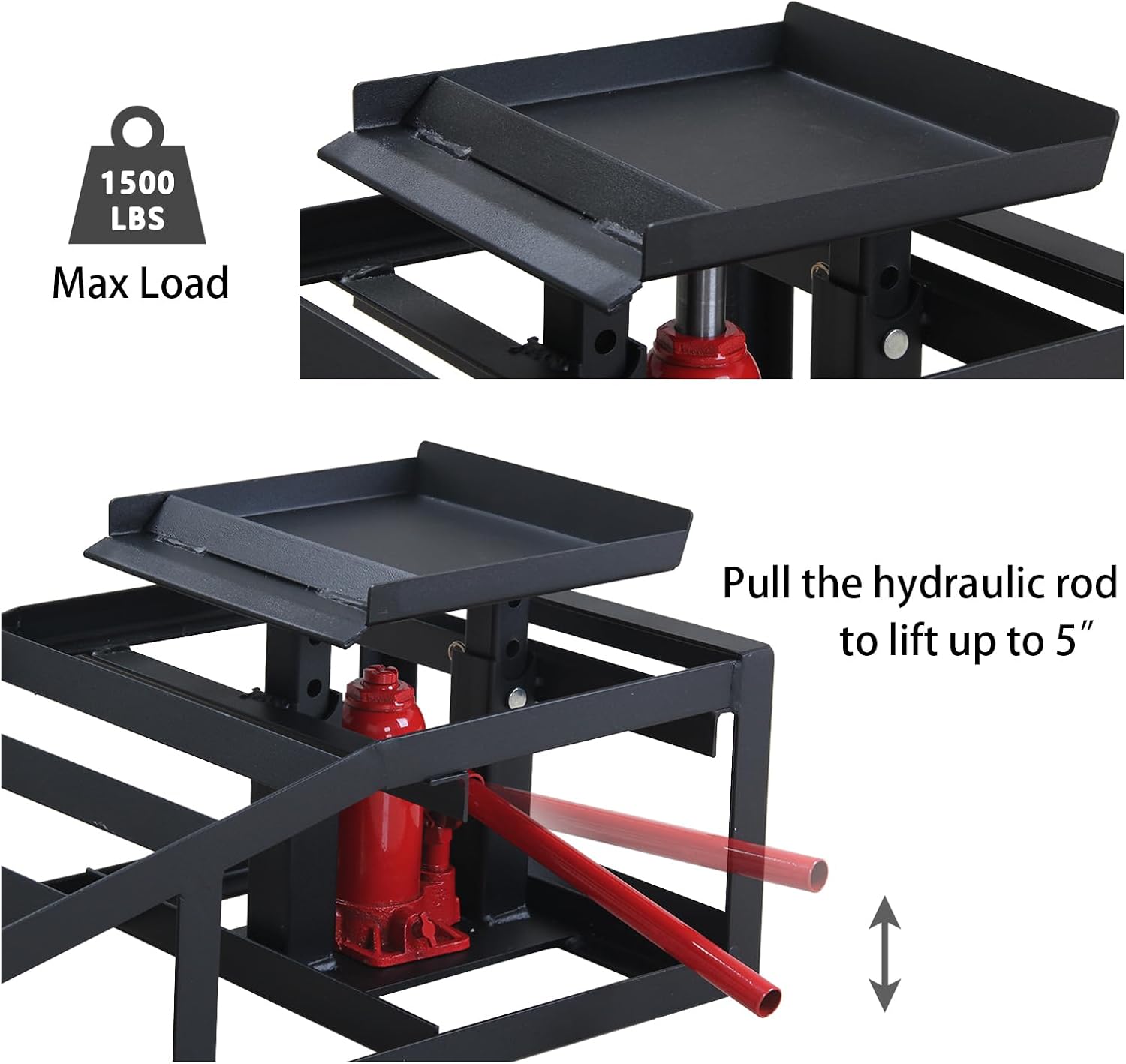 - Thoughtful Design: We considerately provide two handles for convenient controlling the hydraulic jack, and trapezoidal hydraulic ramps are easier to stack and store, and the detachable structure makes them relatively easy to use.