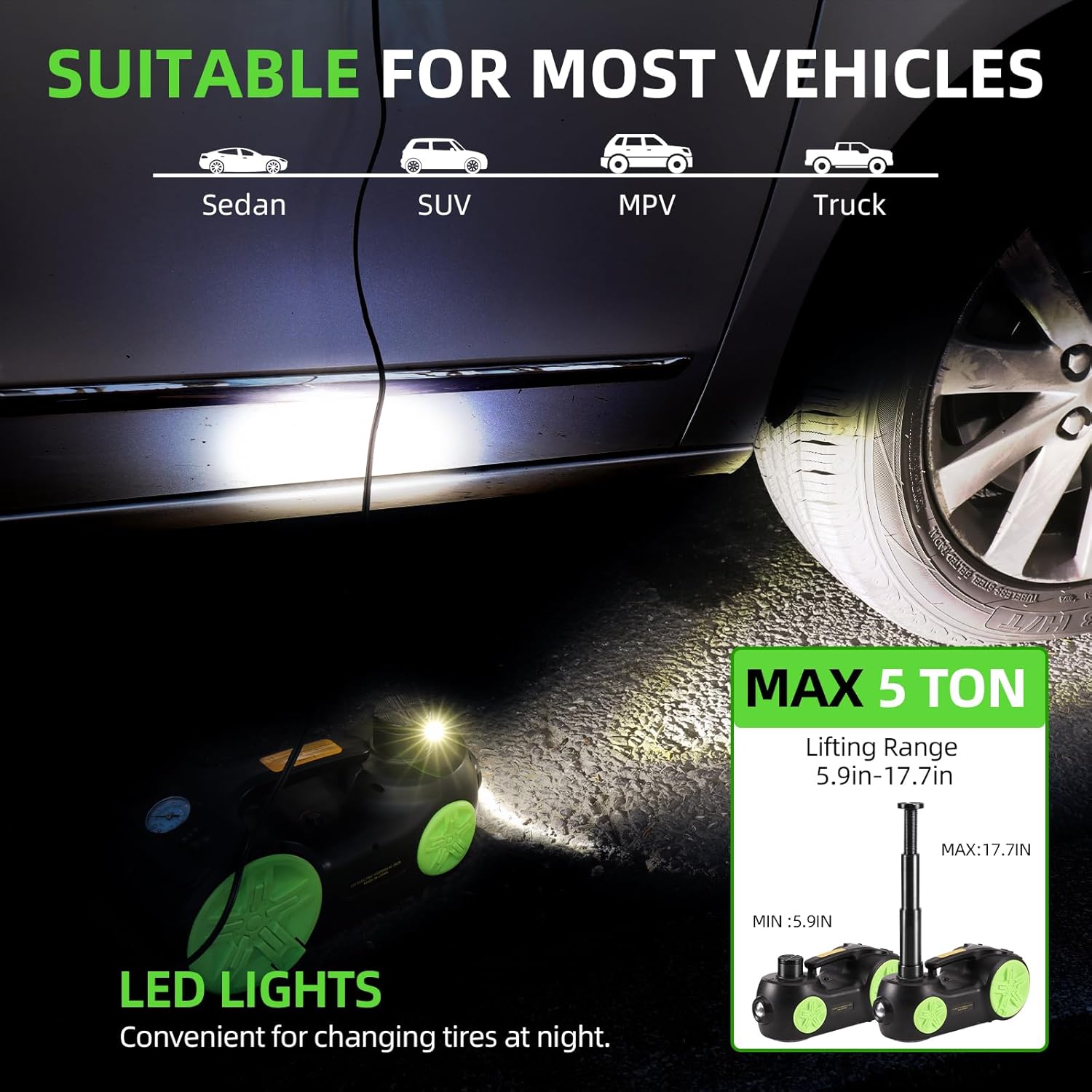 - Safety Guarantee: This 5T electric jack features an automatic stop at max height to prevent sudden drops during power failure, with manual release for safe lowering. Built-in circuit breaker avoids overload