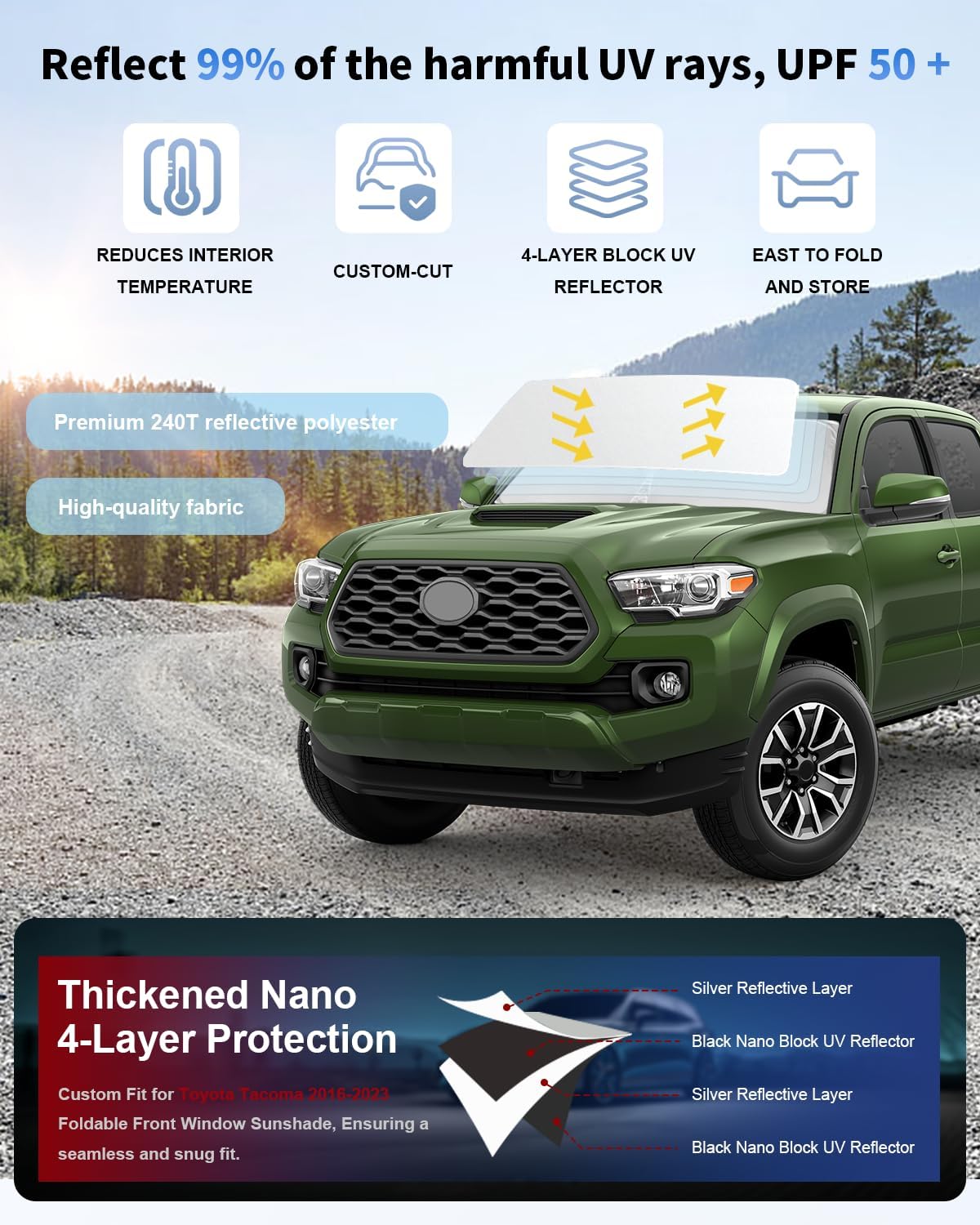 - ☀︎【Vehicle Specific】Our Windshield Shade Cover custom fit for Toyota Tacoma 2016-2026 ,Full covered your windshield,No Gap,100% Perfect fit. Its custom cut design and reinforced steel rings ensure a secure fit well.