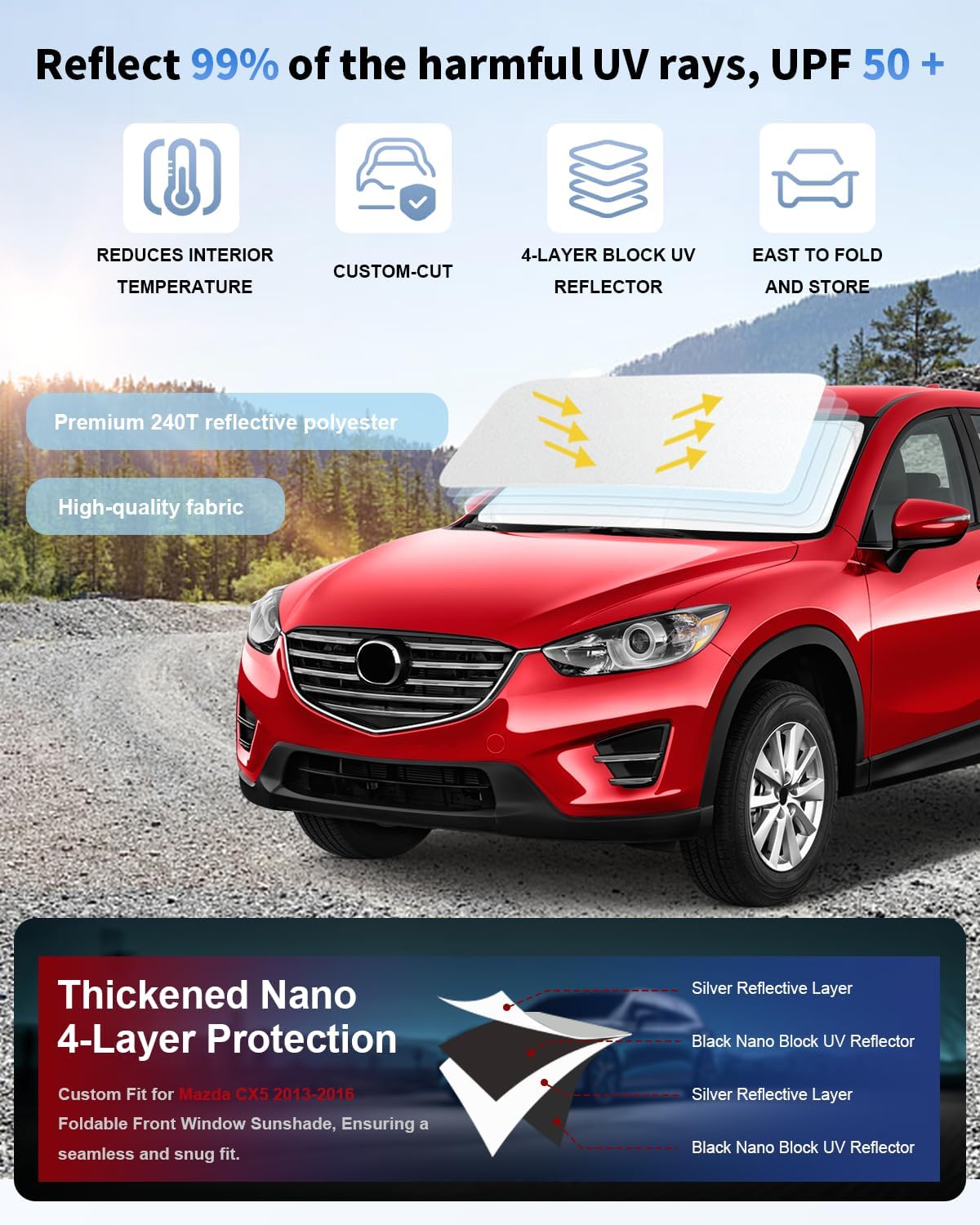 - 【Custom fitment Design】Enhance your driving experience with the SLOGENTO Windshield Sunshades, specially designed for Mazda CX5 owners.Its custom cut design and reinforced steel rings ensure a secure fit, Perfectly fit for 2016 2015 2014 2013 Mazda CX-5 CX5 Crossover.