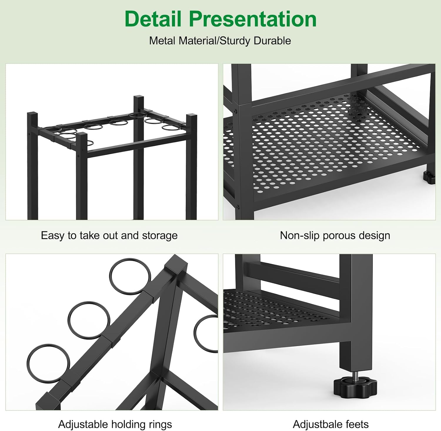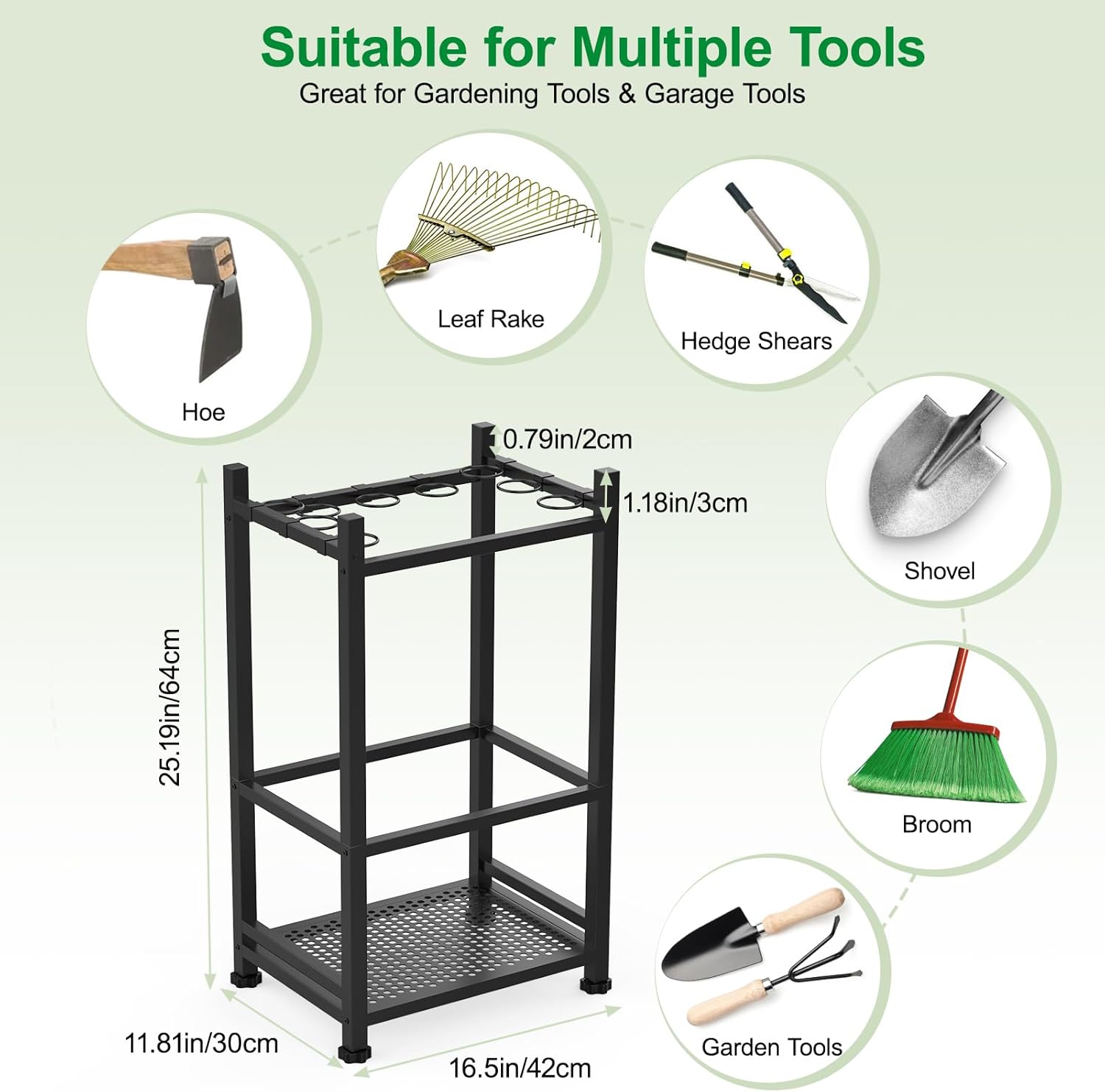 - MULTI-PURPOSE YARD TOOL ORGANIZER: The lawn tool organizer for garage is a must-have for your garden and garage. It is designed with 9 rings to hold handheld tools with larger heads like garden rake, skimmer net. The interior of the holder is arranged to store brooms,mops, hoes, shovels, hammers and other farming tools, categorizing and storing farming tools. Adjustable feet design makes the rack adapt to different ground, especially suitable for indoor, outdoor, garage, shed and other places.
