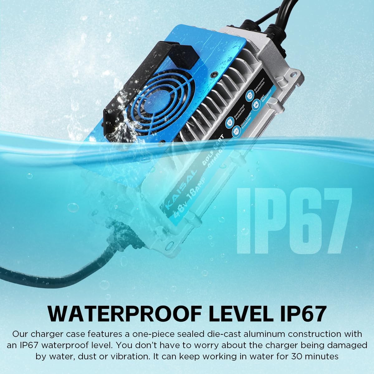- 【IP67 Waterproof & FCC ETL Certification】48v club car charger case features a one-piece sealed die-cast aluminum construction with IP67 waterproof rating.You don't have to worry about the charger being damaged by water, dust or vibration,making it perfect for outdoor use.It adopts PFC and LLC technology and is FCC and ETL certified,providing you with safer charging, lower energy consumption, higher conversion efficiency,better load capacity, less electromagnetic radiation interference and noise.