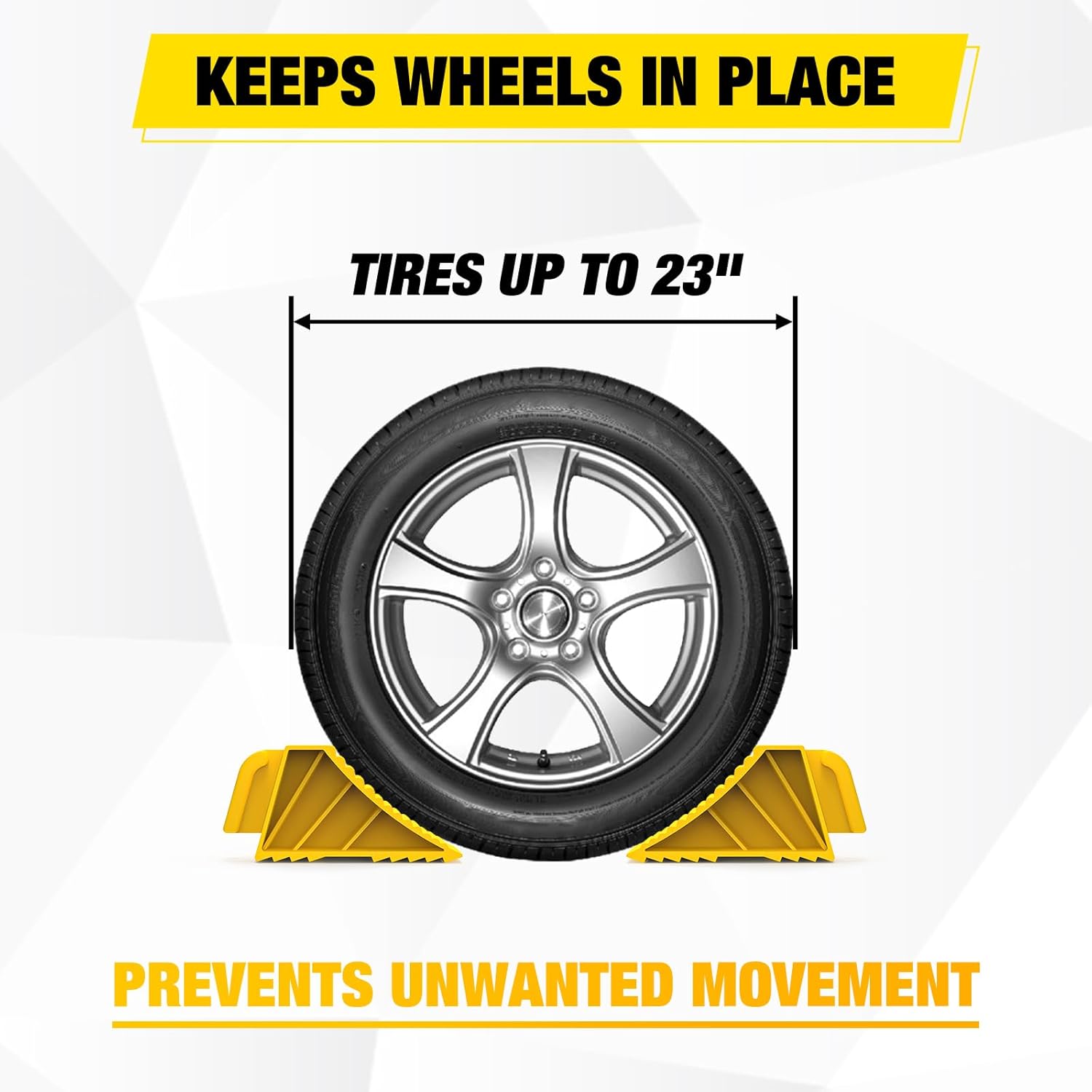 - Widely Used: Suitable for tires up to 23" in diameter. The wheel chocks prevent unnecessary movement, the wheel docks prevent trailer wheel sinking, making them ideal for securing recreational vehicles, campers, boats and single axle mobile trailers