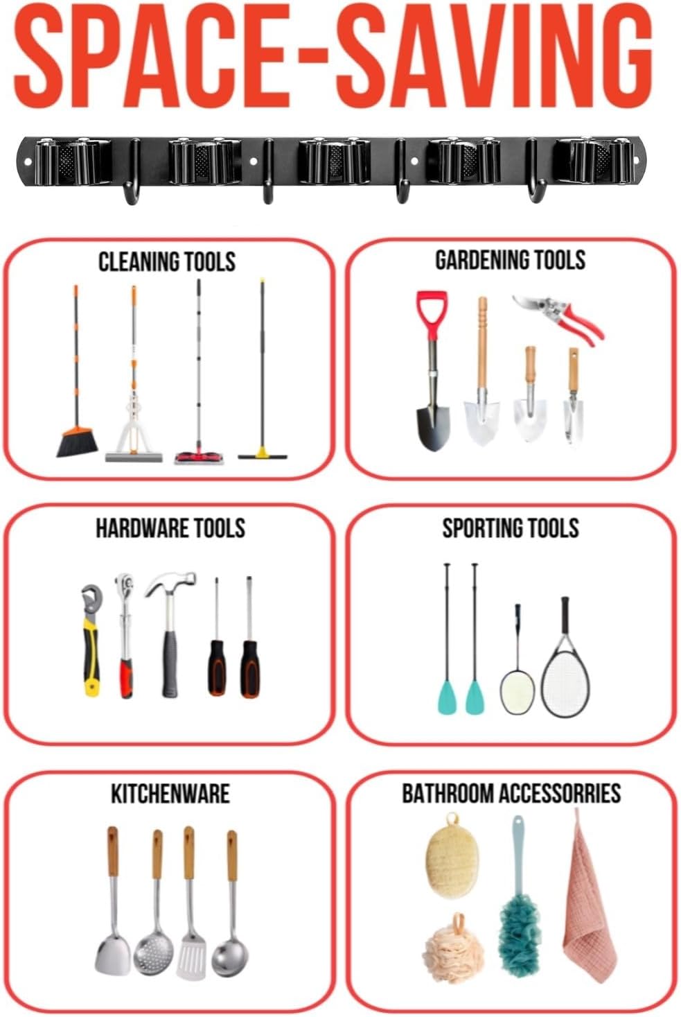 - SAVE SPACE: The wall hangers for brooms and mops provides you easy access to store and grab brooms, dustpans, mops. This tool organizer with 5 gripers and 4 utility hooks allows you to hold brooms, mops, brushes, rakes, garden tools, etc