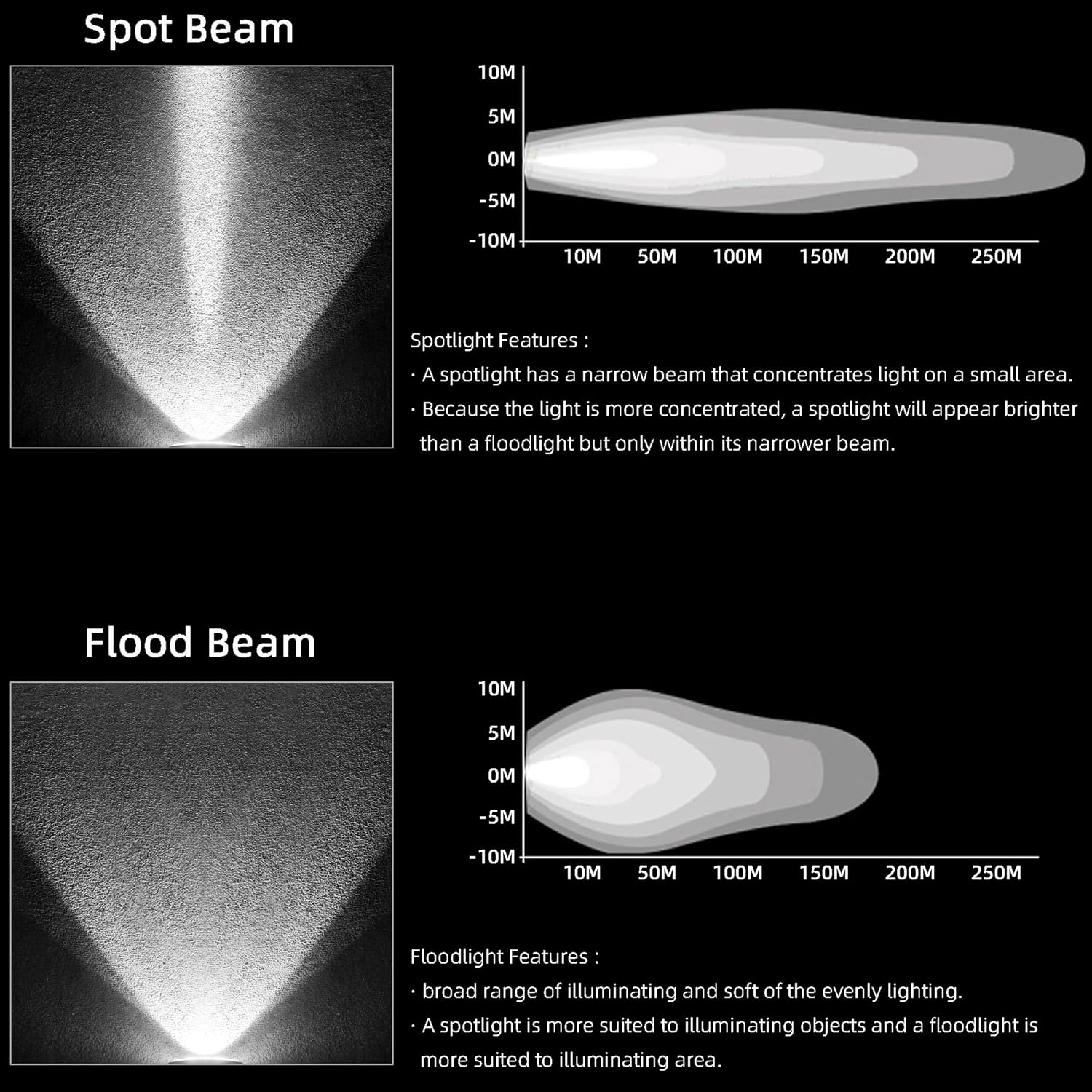 - 【FLOOD BEAM FEATURES】 Flood beam illuminates to broad viewing area, allowing you to see the left and right clearly.