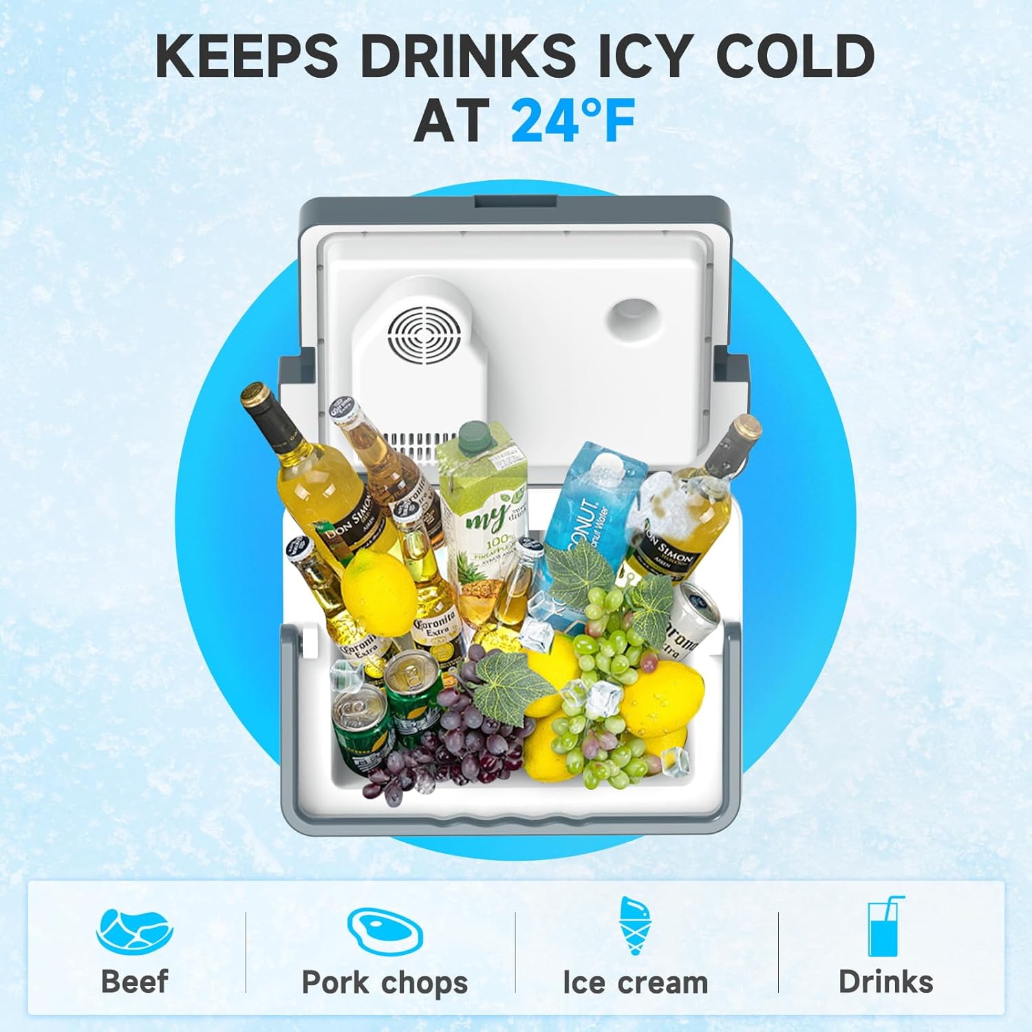 - Keep Cooler and Warmer: Our electric cooler both cooling and heating functions.Maintains the drinks icy cold at 24°F(-4.5 ℃) or the hot food at 147°F(64 ℃).Whether you're on a road trip or camping in an RV,this car cooler guaranteed to keep your drinks cold and your food fresh!