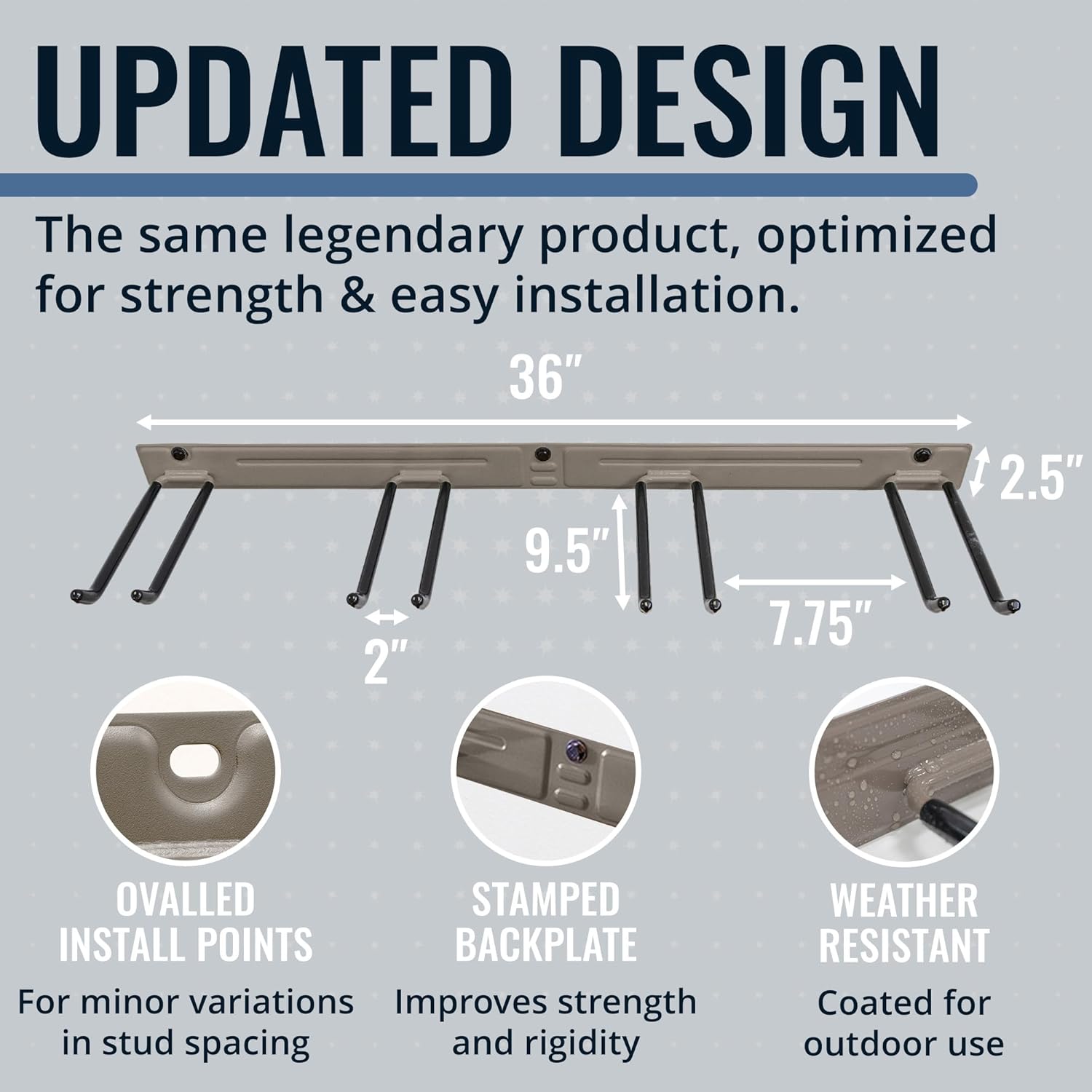 - RECLAIM YOUR GARAGE – Conquer clutter with this garden tool organizer designed for garage storage, sheds, or workshops. Measuring 36" L x 9.5" W x 2.5" H, it features four PVC-coated garage hooks and a 250 lb weight capacity, ideal for storing shovels, brooms, rakes, and power tools. Installs with 3 heavy-duty lag screws directly into 16" wall studs for secure, long-lasting support.
